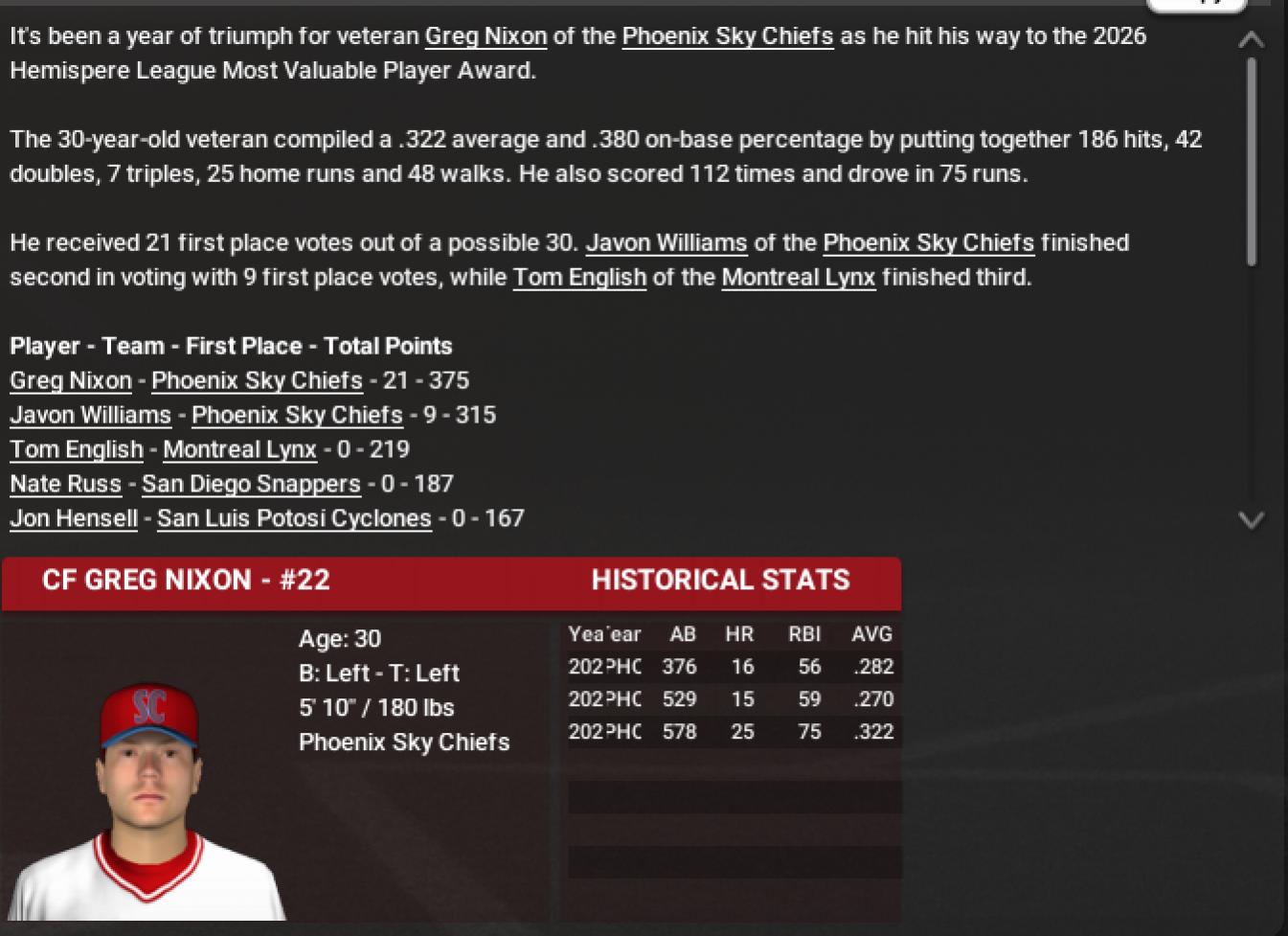 All stories have a beginning but our story begins two years after the Major Baseball League' inaugural 2024 season. In the inaugural season, Montreal was a division winner and World Series loser. A better 2025 squad saw them ride into the postseason once again, and, even with two of the starting SP's on the IL the majority of the season, Montreal lifted the crown. Why am I doing this now? I wanted some history first. And I've the last time I did an AAR, it was for EU4 back in 2013. That's neither here nor there. And before we continue, a break for more background of the technical variety.