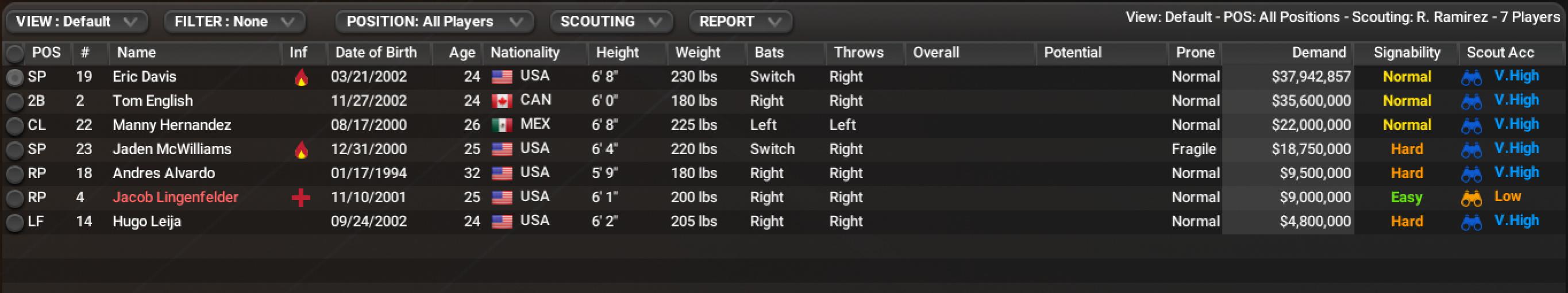We sign both McWilliams and Martinez. There's simple not enough good hurlers to let Mc dub go. Martinez, maybe. But he can play LF and we're in desperate need of a bat and all FA bats are overpriced. We get Martinez for 3 yr/8.5 mil and Mc dub for 7yr/ 15 mil with a opt out after 3. W In other big news, Expansion! Two new teams are coming into the fray. Welcome to the league Havana Judges and New York Explosion. During the expansion draft, no Lynx were taken. The offseason went on pretty quietly. We pick up a middle reliever in Sopp. We pick up two good looking players in the INT round, hopeful they'll payoff. Dev lab is a wash this year, all no improvements + another poor outcome, our second, this time with CL Rodriguez. In over a dozen seasons of OOTP I've only had two poor outcomes and both have been here. Our system looks grim. My drafts have not been great with Gross our only top 100 prospect and the system ranking at #23. Top players wise, English ranks #10 and Buck ranks #3 in their respective hitting/pitching. But we come out of Spring in a bit of rough shape. The owner says playoffs but BNN puts us in full rebuild mode, predicting us to go 68-94.That could be troublesome and spell a quick end if we get fired. Given the system, a rebuild will be at least 4-5 seasons long in all likelihood given our lack of budget to supplement from non-draft sources. We'll see. |