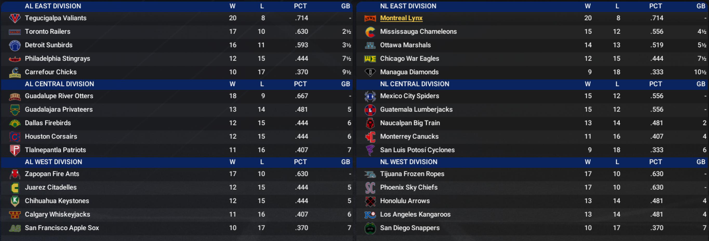 We open the season with two series at home. Our first series against Monterrey, we show up without our bats, scoring only one run the first two games. We find our bats in the 3rd game, striking for 12 runs but having the injury bug strike back. Guiterrez goes down for 3 weeks and Grizz Guzman goes down for 3-4 months with a torn meniscus. Devastating. We don't have a ton of depth either. 1-2 We go onto the picked over free agent market and find Marrero, a 1b who can play 3rd. We sign him to a 1yr/1.5 million contract. That'll do. The second series has Guadalupe visiting and they don't like the bagels or the air in Montreal as we record our first sweep of the season. 3-0 Hitting the road for the first time of the season, we land in Naucalpan. We set the tone for the series as McWilliams goes 8.1 of perfect baseball before surrendering a hit. Still, we carry the momentum and other SPs take note as we sweep the Big Trains away. 3-0 Next is the windy city where the wind is blowing in. Our pitching continues to dominate and we take 3 of 4, ending out streak of 10 straight. 3-1 Dallas comes into Montreal for the next series. Our pitching comes back to earth but our offense holds strong and we take the series win. 2-1 Guatemala follows Dallas. We drop the first but take the next two. We have yet to drop a series since our very first against Monterrey. That changes however when we head down to Tijuana who are off to a hot 15-7 start. Their baseball is OBP for days. We feel that to our core as McWilliams walks a record 8 in 5 innings. We walk 4 more that game. Buck pitches game 2 and holds the Ropes to 1. But they come back and score 12 the next day, taking the rubber match. 1-2 We get Gutierrez back and shift Marrero to 3rd. He's been a solid contributor, batting .330 with 4 HR and 13 RBI. Last road series of the month puts us in sunny San Diego. In the first game, our BP collapses as they give up 6 runs between the 7-8th and we lose 7-6. But we get a pair of QS from our T-brothers, Taveras and Turrieta. We take the series 2-1. We have one game against San Luis, the team we lost to in the playoffs and team Mike Bryan, our AS 1b signed with. He's off to a heck of a month and the following day takes the batter of the month award. Still, we have Buck on the mound and he shuts down all bats, including Bryan who went 0-4 on his return to Montreal. We win the game, 3-1. 1-0 Can't complain. We carry our Spring Training right into the season, finishing a flashy 18-8. Our closer, Bobby Rodriguez, whom we picked up last year, is off to a dream start. He even picks up pitcher of the month with 10/10 saves and a 0.75 ERA. Love to see it. |