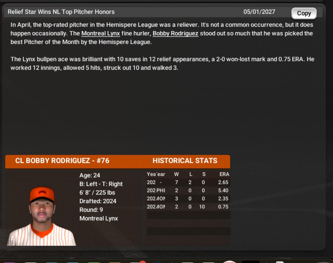 The month starts off with us wrapping up our series with Tijuana. We split it. 1-1 The last of our homestead sees Honolulu coming to town for four straight. We take 3 of 4 including a 9-0 emphatic win in the last where Buck throws 7.2 of shutout ball, losing out his no-hitter in the 7th. 3-1 Pre-draft series sees us up against fellow division team, Mississauga. They get two over us to take the series. 1-2 We're pick 24th in the draft after last season's late season playoff push. At 24, our scout recommends Paxton. He's a strong in the batter's box across the board and in the mock, was set to go just under the top 10. Main problem is, he's asking for big bucks. I bite the bullet and draft him. A financial mistake in all likelihood. With our supp pick we pick up a finesse pitcher Edwin Castro. Middle of the road stuff but dynamite control and a potential 20/20 on HRA. I like that even with a pitcher's park. We take him at #41 and scout's see him as a #2 maybe #1 starter. Baseball continues with a mini series against division rival Ottawa. We take both and leave the Capital to let them lick their wounds. 2-0 Back in Montreal, we face another divisional team, this one a threat to the crown this year in Managua. The first two are pitcher's duels, what we want with the second going 16 innings. We do lose the last though, missing the sweep. 2-1 .500 ballclub Phoenix then comes into town. We do the same to them, winning the first two in pitcher's duels but dropping the last one. [B]2-1[/B Then to the road and to the windy city, where wind is welcome this time of year. The first game goes 14 innings but we win out. We get shutoff in the middle game but return the favor in the rubber match with Buck, on fire at this point, throwing 7.1 of shutout ball. 2-1 Down in Mexico City, home to one of my favorite Japanese listening bars, the first game is a shootout in extras but we take it home with a 10-8 win. We win the next but drop the last. Another series W. 2-1 The final series of the month pits us against bottom feeders Toronto. Buck leads off the series and pitches more shutout ball-- 8 innings of it this time. Rodriguez comes in to pick up his 27th save, going 27/28 with a 0.47 ERA. And he's not even at full potential yet. We win the next with one to play next month. 2-0 We rebound with another strong month at 17-8. The big difference so far this year is those 1 run games being wins instead of loses. We're 17-7 in one run games, much of that thanks to Closer Bobby Rodriguez. We're playing 5 games above Pyth record but lets hope the boys stay hot. A check in on Former Lynx sees both Velez and former star Closer Valencia doing well at 1.5 WAR. Fig is a BP man now and we were right to dump him. Post draft Dev update. We're at 15th in the league. Top two picks Paxton and Castro come in at 49th and 74th, not bad. Both are showing a pretty early trajectory in the pipeline, coming into the league in 3 years time. 108th Gurrola went down with a torn UCL earlier. Hopefully that won't affect him too much. |