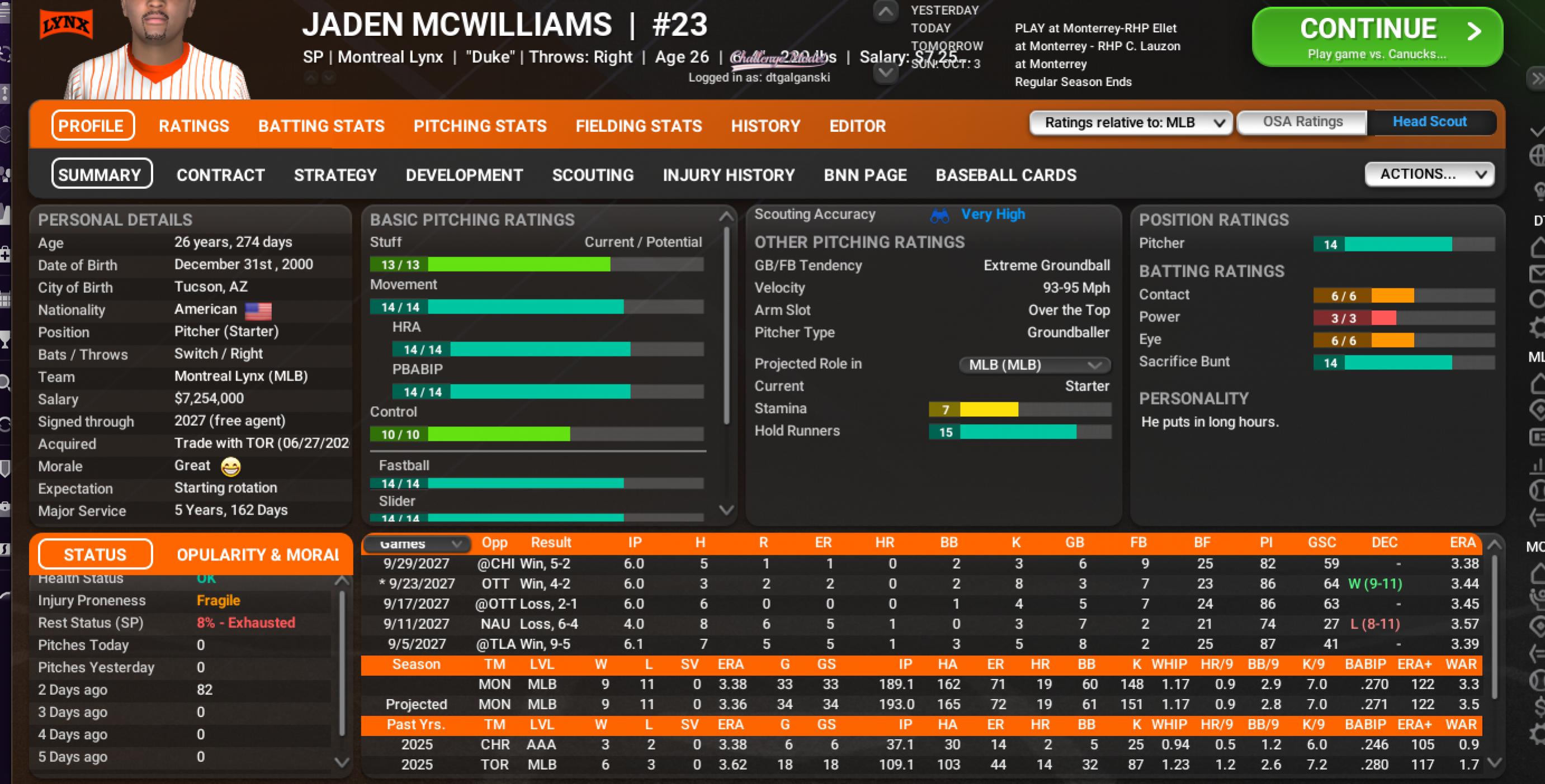 The whole month, we keep a close eye on trades, needing to dump Figueroa and Newman at the least, maybe Bonilla and Asenjo. Velez and Bryan are far too expensive for anyone to bite. June starts off in Tijuana, where, after taking the first game, we drop the next two, losing the series, 1-2 We come back to Montreal for a 6 game homestand, first off against San Luis who are already cruising a cool 15 games above .500. In a surprise, we take 2 of 3, blanking them on the final game of the series. 2-1 Monterrey is our back half of the homestand and we continue fine form, winning the series, scoring 16 over 3 games. 2-1 A funky, two game away/home split comes next against Mississauga. The away game is a pitcher's duel won by Asenjo then a hitting bonanza in the second with Bryan going 4-5 with 4 RBI. 2-0 On the turn of the half-month, we hit black ice and start a heavy slide. It starts on a six game roadtrip with the first stop against tough Detroit who sit atop their division. We suffer a sweep despite Velez's return. 0-3 Next stop Carrefour who boast a similar record to Detroit. Another tough team and we only tough out one W. 1-2 At this time I'm deep in my calls. No one wants Fig. I don't blame em, he costs 14 and 23 million and after his injuries, is a #5. Newman is more desired however so I decide to package them. I'll get less but the most important thing is getting money off my books. I do a few AAA traders for 5 million in cash so I can sign my draft picks. 1-20 pot gives a lot of room for error but we pick alright at the back end of the draft, picking up the #190 prospect CF Zach Davis, #88 prospect SP Carlos Gurrola, #155 SP Lee English, and #189 1b Luis Martinez. Not great, not bad. Although we can't get our hands on anyone that close to majors ready. A homestand comes back around against two more over .500 teams San Diego and Honolulu. Trounced as back-to-back sweeps push us down the WC race. Velez, pitching well with a 3.07 ERA is 0-4. We go 0-6 here. But we do deal Fig and Newman. We only have to retain 20% of Fig's contract which is as low as I could go. We get a #4 SP in return who we have team control of and has room to grow into a #3 at min along with a OF who won't bring Newman production but should serve us for now. Last series of the month we go to Guadalupe and, in a summation of our Off this year, win the first 11-8 and lose the next 0-1. Series split 1-1 Buck is back though in that 0-1 loss. We need him. 9-16 for the month keeps us in 3rd in the div but drop us 5 out of WC contention. Better than I hoped. I waffle on signing Bonilla who wants 4 yrs, 19mill. July should be a busy one. Last edited by dgally; 08-30-2024 at 02:23 PM. Reason: forgot a prospect |