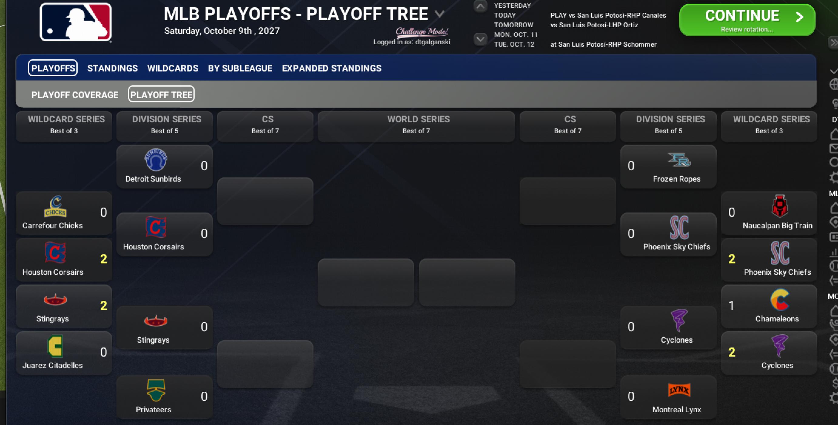 But first, October regular season baseball. Looking to gain momentum, we step into our Monterrey series winning the first game emphatically, 9-2. However, we drop the next two. We have a first round bye. The first round goes quickly with all but one team sweeping their series. We face the only 2-1 winner. San Luis Cyclones. The team we lost to last season in this same series (though they had the bye then). This time however, they have star Mike Bryan, former 1b for the Lynx. The series starts at home. Game 1, Buck vs Canales. They score a knock in the first, a HR from Bryan...welcome home. We tie it up in the 3rd but they score 3 in the 4th. The affair stays low key from there and we lose at home, 4-1 going down 0-1 Game 2. McWilliams makes his case for an extension, pitching 7 innings of 5 hit ball, giving up 1. Same score, swapped. We win 4-1 to even the series at 1-1 Game 3 sends us to San Luis. Our offense stayed in Montreal. We fail to score a run despite a solid 6 innings from Tavares. We lose 3-0 and get our backs pushed against the wall 1-2 Game 4. I make the decision to start a fatigued Buck over Asenjo who's pitched well. I like my BP so I don't mind. The decision haunts me however as the Cyclones knock Buck around for 4 runs in the 1st. That's not a mountain for us but it's a big ass palatine hill with our offense, struggling. Buck settles and we claw 1 back in the 3rd and another in the 6th. But claws run dull and we lose, the Cyclones becoming a boogeyman as they take the game 4-2 and the series 3-1 The Frozen Ropes go on to beat the Cyclones however and then sweep Detroit, who lost last year too, to take their first World Series. Offseason Part 1 is next. Extensions and signings. |