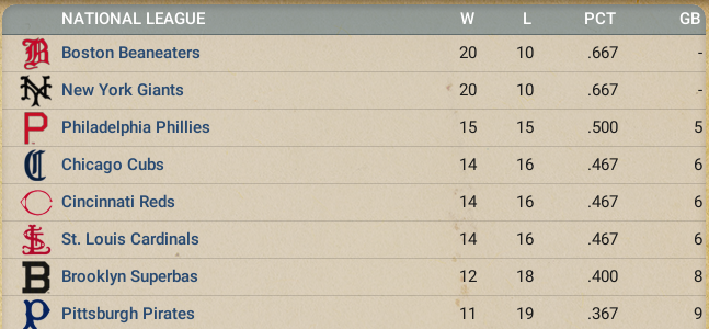Picking up the win was Johnny Lush (2-0) who tossed the complete game shutout in which he permitted just 3 hits, 1 walk, and 1 hit batsman in his 95-pitch gem; Game Score 84. Veteran pitcher Kid Nichols (0-2) was burdened with the loss after allowing 4 earned runs on 7 hits, 2 walks, and a balk in 8-innings of play; Game Score 53. While the offense was not as active as it has been in recent games, Boston was led by John Farrell (1 for 4, Run, Stolen Base), Johnny Lush (2 for 3, Run, Stolen Base), and Danny Shay (1 for 4, 2 Runs, RBI). Danny Fultz (2 for 4) played well in the loss. Player of the Game: Johnny Lush (Season: #1 / Career: #23) American League Standings: Tied 1st Place