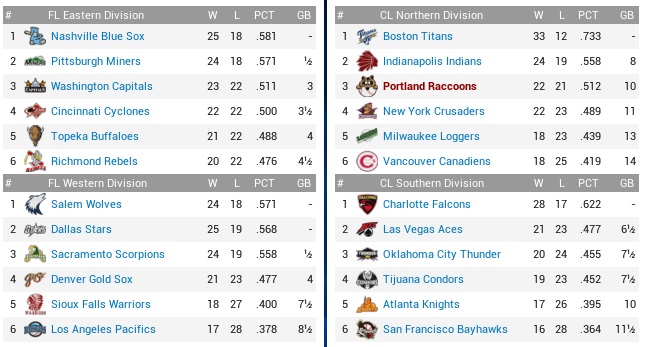 Let’s just say, between these two teams there was a lot of disappointment in the Portland ballpark. The Loggers were in seventh place in runs scored in the Continental League, but still in the bottom three in runs conceded and last outright in bullpen ERA. The Loggers were also one of only four teams the Critters had a winning record against (7-4) in 2022. The others were the Elks (8-3), Knights (5-4, F), and Rebels (2-1, F). Projected matchups: Ryan Nielson (4-5, 3.32 ERA) vs. Morgan Shepherd (3-7, 4.47 ERA) Jesus Chavez (0-2, 4.35 ERA) vs. Victor Arevalo (6-11, 5.32 ERA) Travis Garrett (6-5, 6.15 ERA) vs. Ian Prevost (8-8, 3.46 ERA) Rico Gutierrez (5-4, 2.57 ERA) vs. Chris Sinkhorn (8-6, 3.43 ERA) Three right-handers, then Sinkhorn, still the defending Pitcher of the Year. Let’s assume he’s not gonna be it in ’22, and Toner won’t be it either, who’s gonna steal the crown? The Raccoons started the week by disabling Brian Perakis with his ankle woes and recalled Dwayne Metts and his sparkling .095 batting average. Omar Alfaro still had punishment time in St. Petersburg! Game 1 MIL: 3B A. Velez – 1B Jaeger – CF Coleman – LF Berntson – C Wool – 2B Stewart – RF Reese – SS Dasher – P Shepherd POR: LF Carmona – CF Stevenson – 3B Nunley – 1B Rockwell – C Rice – RF Graves – SS Armetta – 2B Spencer – P Nielson An 0-2 pitch that struck Alberto Velez and then a Kevin Jaeger grounder that vanished in Nielson’s pants to begin the week somehow didn’t blossom into a 5-run inning. The Loggers scored zip in fact, though credit should go to Stevenson, who spoiled a mighty drive to center by Jon Berntson. Stevenson was also the first Critter on base, singling in the bottom 1st, which Nunley also did to put two on for Gil Rockwell, who grounded straight to Tyler Stewart for a double play. The two teams tallied up 11 base hits in the first five innings, yet scored zero runs. The Coons had six hits, including a Stevenson triple, and drew a pair of walks, AND got an error by Craig Dasher (a makeshift shortstop at best!) in the bottom 5th instrumental in loading the bases, but still couldn’t get anybody across. In that inning, Cookie singled, Stevenson reached on the error, Nunley flew out to deep left, and Rockwell batted with two on for the third time in the game and after a double play and a strikeout drew an actual walk this time. Three on, two down, Danny Rice struck out, Shepherd’s ninth victim in the game. The Loggers hurler at one point struck out five in a row, and romped his total to 11 by the sixth. Following Zach Graves’ leadoff single that hit off Tom Reese’s shoe in rightfield, Sam Armetta popped out before Jarod Spencer and Ryan Nielson both whiffed. Cookie hit a leadoff single in the bottom 7th, stole his 27th bag, then was stranded. Stevenson and Nunley hit balls right at people, and Rockwell completed Shepherd’s dirty dozen. At least that was all for Shepherd, who was done after 112 pitches. Mike Denny drew a leadoff walk in his spot in the top 8th, but was doubled off when one first baseman (Jaeger) lined out to the other first baseman (Rockwell). Rockwell would even make three nice plays in the ninth inning, containing two spiced grounders by Ian Coleman and Jon Berntson, then scooped Armetta’s terrible throw on Stewart’s grounder following Josh Wool’s single to center. Nielson completed nine – but the Coons were still not on the board! Tim Stalker batted for him to lead off the bottom 9th and reached base – the fifth straight inning with the leadoff man on base for Portland!! – on Stewart’s clumsy error. The Coons outrageously signaled COOKIE to BUNT. Desperation had many faces – this was one of them, easily. Cookie hadn’t bunted since elementary school, knocked it back to the pitcher Mike Kress, and Kress threw to second base … wildly. Two on, none deserved! Josh Stevenson looped a ball to shallow center, Coleman coming in, in, in, lunging, sliding OHMYGODHEMADETHECATCH!! STALKER STANDS AT THIRD BASE!! Fortunately Coleman was in no condition to make a play at second base after digging up the field with his headlong slide, the ball landing just barely in his outstretched glove. Had his arm been one inch shorter, the Coons would have walked off, but no Stalker had to dig his way back to second base, arriving there with his own head-first slide. Nunley flew out to left. That brought up Rockwell. Kress fell behind 2-0, then condeded a fly to right. Tom Reese over – but not over far enough! The ball found the gap, and the Coons walked off after all …! 1-0 Blighters! Carmona 2-4; Stevensno 2-5, 3B; Rice 2-4; Nielson 9.0 IP, 6 H, 0 R, 1 BB, 5 K, W (5-5); Doubly-unearned walkoff… oh well, who am I to complain? This was the 30-year-old Nielson’s first career complete game and also first career shutout in 28 games started. Game 2 MIL: LF Tesch – SS Dasher – CF Coleman – RF Gore – 3B A. Velez – C Wool – 1B Reese – 2B March – P Arevalo POR: LF Carmona – CF Stevenson – 3B Nunley – 1B Rockwell – RF Graves – 2B Armetta – SS Stalker – C Prieto – P Chavez Chavez entered the start with exactly 60 major league innings across ten starts, and a 1-6 record and 5.25 ERA. That was … improvable. However, starting the game with a 4-pitch walk to Brad Tesch was not something that would improve your resume in the long run. The Loggers quickly went about dissecting Chavez in the first inning. Dasher singled, Coleman hit an RBI single, and after Brad Gore struck out, Alberto Velez hit an RBI double to center. Josh Wool hit a liner to right that fell for an RBI single, with Graves throwing out Velez at home plate. Good, good! We’ll have to take outs any way we can! Reese struck out to end a 3-run first, and by my count the Coons weren’t due another run until like Friday, so that was that. Come back again tomorrow, people. Thanks for paying! While Chavez shook of the suckage after the rough first i