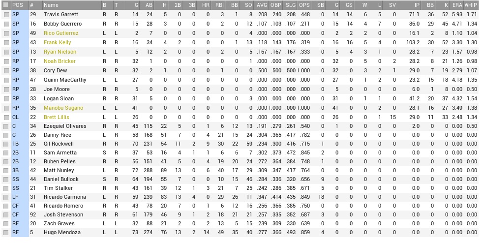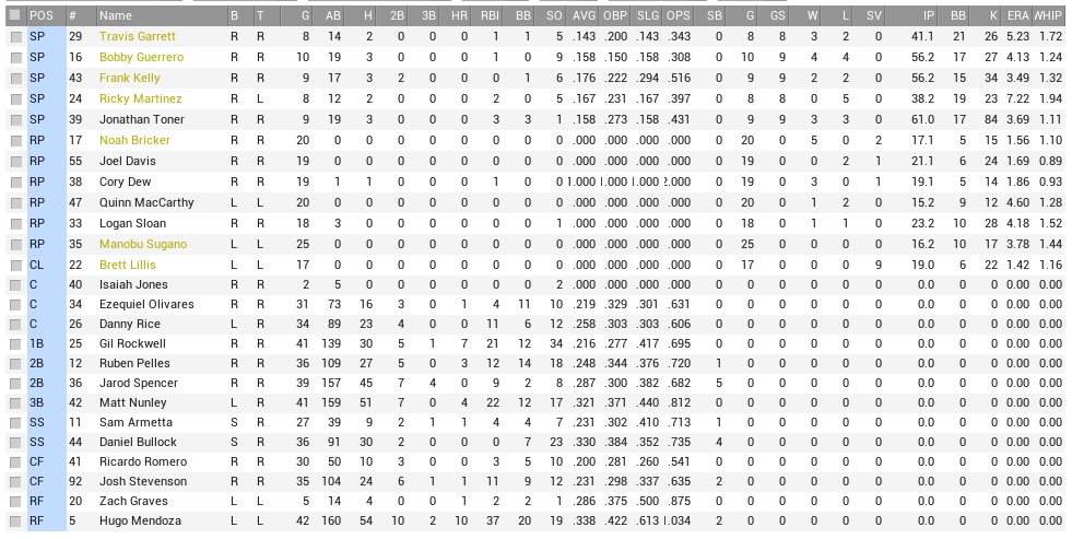 There were things to like and things to hate on the Knights, who were second from the bottom in terms of runs scored, not doing well in any particular category. They were fourth in terms of runs allowed, but that came with an asterisk. Their rotation was the second-best in the league with an ERA just a whisker under three, but they had an incredibly decrepit bullpen that was posting an outrageous 5.62 ERA – far and away the worst mark in the league. But they were to be treated cautiously – just on Sunday, they had crushed the Titans in a 17-0 rout. The season series however had been all Coons so far, as we had swept them during our first meeting of the season. Projected matchups: Frank Kelly (3-2, 3.02 ERA) vs. Luis Hernandez (3-2, 3.41 ERA) Ricky Martinez (0-5, 6.31 ERA) vs. Jonathan Ryan (3-2, 3.32 ERA) Travis Garrett (4-2, 5.44 ERA) vs. Luis Flores (6-2, 1.39 ERA) The left-hander Flores had the best ERA in the entire league, and was also their only left-hander. They had one significant injury in outfielder Marty Reyes, who had appeared in only 14 games so far this season and was laboring on a torn rib cage muscle ever since. Oh happy day – Cookie Carmona came off the DL to begin this series and slotted right back in the leadoff slot, pushing Bullock to second, and the walk-resistant Jarod Spencer to the bottom of the order. Game 1 POR: LF Carmona – SS Bullock – 3B Nunley – RF Mendoza – C Rice – 1B Rockwell – 2B Spencer – CF Romero – P Kelly ATL: CF Stuckey – SS T. Jimenez – 1B Herlihy – 3B Avalos – RF Fullerton – 2B Hibbard – C C. Ramirez – LF Folk – P L. Hernandez Cookie returned with a leadoff single off Hernandez, but was quickly forced out on Bullock’s grounder to Devin Hibbard. Bullock however stole second base, then scored on Nunley’s single. Mendoza ran a 3-0 count before popping out, which was so great to see, and the Raccoons scored only the one run in the opening inning, but would get another one in the second inning when Ricardo Romero knocked his first home run as a Critter, a 2-out solo job to leftfield. It was not exactly smooth sailing however for Kelly, who had his first batter on base in the game; Johnny Stuckey took advantage of Gil Rockwell’s clumsiness for an infield single for a really, really undeserved infield single. Kelly got through that, then had runners on the corners in the second inning. A key strikeout to Brody Folk and Hernandez’ pop in foul ground bailed him out of that, and when Tony Jimenez singled in the third inning and Kelly drilled Trent Herlihy, but Tony Avalos hit into a double play. Top 5th, Romero had an infield single leading off, and Kelly dropped down a bunt. It was a real dandy; Avalos had to hustle in at great speed, had to fire on the move, and missed Herlihy, badly. The throwing error put runners in scoring position with no outs for the top of the order. Cookie was up to the job, singled up the middle, and drove in the third run of the game; Kelly was held at third base, but would score on Nunley’s groundout later, giving Kelly a 4-0 lead. Rockwell would have two moments in the sun after that, first picking off Folk from first base after Stuckey lined right into his mitten in the bottom 5th, then homering off Hernandez in the top of the sixth, a solo job that was kindly acknowledged by the team whose insignia would once adorn his Hall of Fame plaque. Kelly maintained a shutout through six, getting another double play turned in the bottom 6th, but then loaded the bases with nobody out in the seventh. D.J. Fullerton’s double was followed by two walks. Folk popped out behind home plate, courtesy of Danny Rice, but that was it for Kelly. With the left-hander Joe Cowan pinch-hitting for Hernandez, Sugano replaced Kelly. Sugano extricated the Critters from the inning with only one run scoring on Cowan’s sac fly to right, and struck out Stuckey, maintaining a 5-1 lead, which Jarod Spencer extended to 7-1 in the eighth against left-hander Antonio Quintana. Finding Mendoza and Rockwell in scoring position, Spencer singled to right, scoring them both, but the bottom 8th brought more trouble. Cory Dew allowed a leadoff single to Jimenez and was swiftly replaced by David Kipple, who also didn’t seem inclined to retire anybody. He walked Herlihy, and Avalos singled; three on, no outs. Alas, the Knights wouldn’t score, although that required help from Noah Bricker. Kipple whiffed Fullerton, but then was replaced for the right-handers that approached. Bricker struck out Hibbard, and Chris Ramirez flew out to center. That was the last threat in the game. 7-1 Raccoons! Carmona 2-5, RBI; Rockwell 2-4, HR, 2B, RBI; Romero 3-4, HR, RBI; Bricker 1.2 IP, 0 H, 0 R, 1 BB, 1 K; Game 2 POR: LF Carmona – SS Bullock – 3B Nunley – RF Mendoza – C Rice – 1B Rockwell – CF Stevenson – 2B Armetta – P Martinez ATL: RF Stuckey – LF Folk – C Luna – SS T. Jimenez – 1B Herlihy – 2B Hibbard – 3B Avalos – CF Cowan – P Ryan Crowned by Tony Avalos’ 2-piece over the rightfield fence, the Knights poured five runs on Martinez right in the first inning. There was just no reasoning with this turd. Stuckey led off with a double, and the situation escalated from there. Ricky Martinez was never in command of any at-bat against anybody. This included the pitcher, Jonathan Ryan, who would knock two hard hits against Martinez, a leadoff single in the second inning, and a 2-out RBI single in the third inning that ran the score to 7-0 and ended Martinez’ major league career. Logan Sloan replaced Martinez with runners on the corners and two down, got a fly to right from Stuckey, and thus closed the line at seven runs. The Raccoons had only one hit against Ryan at that point, and were slow to add more, but even when Cookie hit a leadoff double to left in the sixth inning they were unable to get him in. Sloan pitched three innings in relief, allowing another run to the Knights, extending their lead to 8