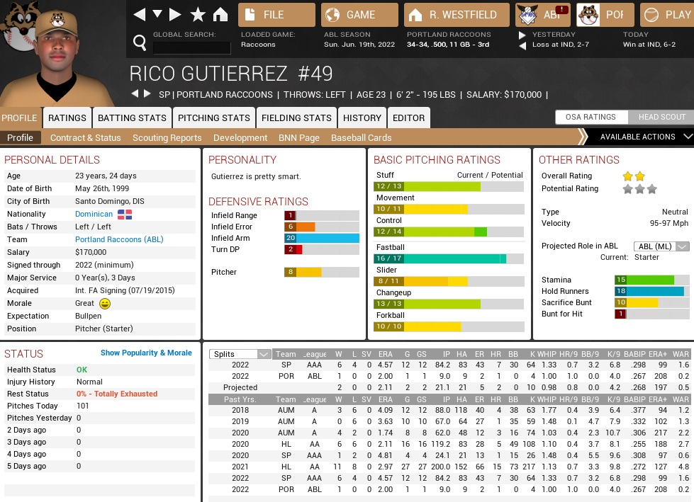 To make room for Pelles on the 40-man roster, AAA outfielder Kevin DeWald was waived and designated for assignment. Raccoons (18-18) vs. Indians (20-16) – May 16-19, 2022 The Indians looked like they had a decent package together after years in the nowhere regions of the division. Coming into the series, they ranked fourth in both runs scored and runs allowed, with their rotation ranking a bit better (5th) than their bullpen (7th) by ERA. They were second in home runs, with Cesar Martinez (.346, 13 HR, 33 RBI) leading the Continental League in bombs, but they couldn’t steal a base, ever, sitting dead-last with just seven bags taken. This was the first series between the two teams in 2022, with the 2021 season series having ended in an even split. Projected matchups: Travis Garrett (1-2, 6.00 ERA) vs. Tom Shumway (3-2, 2.32 ERA) Bobby Guerrero (3-3, 4.36 ERA) vs. Killian Savoie (3-1, 4.11 ERA) Jonathan Toner (3-2, 3.48 ERA) vs. Alvin Smith (0-0, 0.00 ERA) Frank Kelly (2-2, 3.18 ERA) vs. Mario Alva (2-3, 3.83 ERA) We will see two left-handed pitchers to start this series, and then we are still gonna miss their third southpaw, Tristan Broun (2-3, 3.56 ERA). That is unless they start short-starting pitchers, because they have run out of suitable starters. Smith is a 27-year old rookie right-hander with seven career relief appearances, but not a single major league start. Lingering in their pen is also Kyle Lamb (1-0, 3.97 ERA), so there were multiple ways to throw a third left-handed starter at the Raccoons. Game 1 IND: LF Otero – CF D. Morales – RF C. Martinez – 1B M. Rucker – 3B J. Jackson – SS Matias – C Carbajal – 2B Correia – P Shumway POR: SS Bullock – 2B Pelles – LF Mendoza – 1B Rockwell – 3B Nunley – C Olivares – RF Erickson – CF Stevenson – P Garrett Ruben Pelles’ first plate appearance in Portland resulted in doubling up Bullock with a grounder to short after Daniel had opened the bottom 1st with a single. I love those instantly likable new additions! The second started with Nunley singling, Olivares beating Cesar Martinez’ range for a double, and the runs would come in to score on Erickson’s sac fly, and then a 2-out RBI single past Raul Matias by nobody less than Tragic Travis, who had come into the game with 18 walks and 13 strikeouts in 30 innings, but whiffed four and walked none in the first two innings. Granted, he also allowed three hits and barely escaped being piled on early, a pattern that continued into the third inning, in which Danny Morales’ 1-out single and Mike Rucker’s 2-out double were not enough to push a run across for the Indians, with Justin Jackson flying out to Stevenson in center to keeping the runners stranded in scoring position. Matt Nunley added a run in the bottom 3rd with an RBI single coming with two outs that chased home Mendoza, who had doubled into the leftfield corner, from second base. Garrett meanwhile kept wobbling on into the fifth, where Leo Otero hit a 1-out single to center, the sixth base knock off Garrett, who struck out Morales for his eighth K of the game, but not until after moving Otero to third base. The leftfielder stole a base, his fifth of the season and thus more than half the team’s total, and advanced another sack further on a wild pitch. Martinez worked a full count for a walk, Garrett’s first in the game, and Mike Rucker (.266, 9 HR, 25 RBI) came up as the tying run, and of course he was also a lefty slugger. Being kindly reminded that we were unlikely to score another run before Sunday by the pitching coach, Garrett reared back and struck out Rucker to end the inning, his ninth trophy in the game. He’d get one more, whiffing Shumway to end the sixth with runners yet again in scoring position. Those runners, Jackson and Matias, had reached on a single that hopped over Rockwell’s glove to begin the inning, then on Garrett’s own error. Travis’ pitch count went over 100 in the inning and he was hit for in the bottom of the sixth. The Indians had the first two men on AGAIN in the seventh inning, Otero and Morales singling against Cory Dew, and AGAIN left the runners stranded. The Coons added two runs in the bottom 7th on a Mendoza homer to left, and then an unearned run that Rockwell scored on an Olivares double; Matt Nunley had in between reached base on an error by Josh Correia. The extended lead was put to the test, still, in the eighth inning. A Mendoza error put on Jesus Carbajal, and when Quinn MacCarthy replaced Logan Sloan, he walked both left-handers he faced, PH Rogelio Medina and leadoff man Leo Otero. Joel Davis inherited the bases loaded with two outs, lost Morales in a full count to force in the Indians’ first run, but then struck out Martinez as I got increasingly antsy. Despite a leadoff walk to Rucker in the ninth, Joel Davis would turn the rocky outing into a save, retiring the next three batters to end the game. 5-1 Coons. Mendoza 3-3, BB, HR, 2B, RBI; Nunley 2-4, RBI; Olivares 2-4, 2 2B, RBI; Garrett 6.0 IP, 7 H, 0 R, 1 BB, 10 K, W (2-2) and 1-2, RBI; Davis 1.1 IP, 0 H, 0 R, 2 BB, 2 K, SV (1); Pelles went 0-for-4 in his first Raccoons outing. I already love him. Game 2 IND: LF L. Otero – CF D. Morales – RF C. Martinez – 1B M. Rucker – C J. White – 3B J. Jackson – SS Matias – 2B Ventura – P Savoie POR: SS Bullock – 2B Pelles – LF Mendoza – 1B Rockwell – 3B Nunley – C Olivares – RF Erickson – CF Romero – P Guerrero After being stymied all of Monday, the Indians broke out immediately against Bobby Guerrero on Tuesday. Starting with Danny Morales’ single, they reeled off three straight base hits for two quick runs. While Jamal White hit into a force play for the second out, Justin Jackson bombed Guerrero, homering to centerfield and running the score to 4-0 early on. The Raccoons would actually answer that call in the bottom of the first inning. Savoie started his outing by drilling Bullock, who was then forced out on R