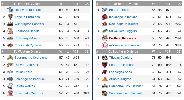 The Raccoons were on a roll … down a steep mountainside. As were the Condors, more or less. The Coons were 5-10 for their last 15 games, while the Condors were 2-6 for their last eight. One team had not had any dreams as the month had begun; the other team had had its dreams seen popped since the All Star break. Well, okay, the Condors were only 5 1/2 games out in the South, and the Falcons were a troubled bunch themselves, so maybe a walkover versus Portland was exactly what they needed. By now, these were the two lowest-scoring teams in the league, the Coons in 11th, and the Condors a whole bunch worse in 12th place. They were scoring a frigid 3.6 runs per game. There was hope to their pitching, with their rotation in fourth place, and their bullpen – recently enriched by Joel Davis – in second in the league, but that kind of putrid offense was hard to compensate. Their run differential was an unhealthy -42 (Coons: -2). The Critters held a 2-1 edge in the season series. Projected matchups: Bobby Guerrero (5-9, 3.84 ERA) vs. Rafael Cuenca (4-6, 3.26 ERA) Rico Gutierrez (4-2, 2.37 ERA) vs. Jose Menendez (6-10, 4.48 ERA) Matt Huf (1-1, 2.86 ERA) vs. Kevin Clayton (6-7, 3.69 ERA) All starters were right-handed for them. On the DL they had their centerfielder, Matt Jamieson, plus two former Raccoons pitchers, Seung-mo Chun and Cole Pierson. The Raccoons had begun the week with a roster change, dumping the horrendous Dwayne Metts for the previously horrendous Zach Graves, but that was the player material we had to work with right now. Game 1 TIJ: 3B B. Rojas – 1B McNeal – C Sanford – LF Larios – RF Boggs – CF J. Gonzales – 2B B. Torres – SS J. Estrada – P Cuenca POR: LF Carmona – C Rice – 3B Nunley – 1B Rockwell – RF Graves – CF Stevenson – SS Stalker – 2B Spencer – P Guerrero Guerrero got picked apart with singles right away; Bob Rojas legged out an infield single, stole his 29th base of the season, and then scored on Pat Sanford’s single, the first of three consecutive Condors batters to single to left along with Omar Larios and Robby Boggs. For a change, Juan Gonzales singled to right, and the sad thing was that Guerrero was on two strikes against most of them and couldn’t retire any. Bobby Torres singled to center, scoring the Condors’ third run, before Juan Estrada popped to short and Cuenca struck out to strand three runners, finally. The Coons would draw two walks (Rice and Nunley) in the bottom of the first, but wouldn’t score, but unleashed some 2-out terror in the bottom of the third. Nunley walked again to start things, followed by straight 2-out singles by Rockwell, Graves, and Stevenson, the latter two each plating a runner to inch the team back to 3-2 before Stalker grounded out to Estrada. Little did we know then that not only was this the last run scored in the game – neither starter looked run-proof at this point – but that Bobby Guerrero would technically pitch a complete game… of five innings precisely. Rain broke as soon as the sixth inning got underway, with Guerrero already at 93 pitches. He threw two more in the inning to Gonzales, then lightning got into the mix. The game went to delay instantly, but the storm that had suddenly approached – the sun had been out as late as the fourth inning – would rage for hours. With the Condors ahead, the umpires called the game after two hours. 3-2 Condors. Nunley 0-1, 2 BB; Spencer 2-2; Bright sides – we didn’t have to involve the bullpen in our misery. Game 2 TIJ: SS B. Rojas – LF Larios – C Sanford – RF Boggs – 2B B. Torres – CF J. Gonzales – 1B Sauceda – 3B J. Estrada – P Menendez POR: LF Carmona – C Rice – 3B Nunley – 1B Rockwell – RF Graves – CF Stevenson – SS Bullock – 2B Spencer – P Gutierrez The Condors scored again in the first inning, and again it involved Bob Rojas singling, stealing (#30), and finally scoring with Sanford batting, this time on a sac fly. The Condors would again pile up singles early, but couldn’t get more runs off Gutierrez despite five hits in the first three innings. Menendez was perfect the first time through the Critters’ order, but Cookie hit a leadoff double to left in the bottom of the fourth inning. Wouldn’t you know it, he was left on base. Rice grounded out, Nunley walked, Rockwell whiffed, and Graves rolled one over to Bobby Torres to end the inning. Probably even sadder from a neutral observer’s watch was the leadoff double that Menendez knocked to center in the fifth inning. Two strikeouts and after a walk to Sanford, Boggs’ pop to Nunley in foul ground had Menendez stranding right there at second base, four batters later. The Coons had the bases loaded in the bottom of the inning. Walks to Stevenson and Bullock, a double steal, and an intentional walk to Jarod Spencer (how else would he ever walk?) pulled up Gutierrez with three on and nobody out. His grounder to first was instantly returned to home plate by Gabriel Sauceda, with Stevenson tagged out by Sanford. The bases remained loaded for Cookie, who flew out to Larios in shallow left, followed by Rice grounding out to Sauceda. Nobody scored. Ever. Gutierrez lasted seven good-ish innings, but still remained on the hook because the miserable lineup could not scrabble together a single run. They had two base hits off Menendez (and five walks) through seven innings. Cookie became the tying run to begin the bottom 8th, singling past Estrada into leftfield. Rice singled to center, and then Nunley hit into a double play and Rockwell struck out once more. Menendez came pretty close to a shutout, only running out of juice in the ninth inning after 116 pitches – those walks be damned! Jayden Reed struck out Bullock to end the game with nobody on base even. 1-0 Condors. Carmona 2-4, 2B; Gutierrez 7.0 IP, 8 H, 1 R, 1 ER, 1 BB, 6 K, L (4-3); I wonder, is Rico Gutierrez more glad that he reached the majors, or more sad that he did so with this lo