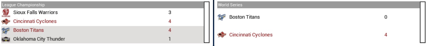 2-5, L3. But, yes. And I just saw that the result is missing from the last Indians game. Looks like we can't do anything 'round here. ![]() ![]() (sigh!) +++ 2068 ABL PLAYOFFS The 92nd annual ABL playoffs would have the 97-75 Thunder as the top seed, winning the CL South by a hefty 15 games. They were entering with the #2 offense and the best pitching in the Continental League and it was hard to poke holes into their roster – except for the fact that it had been taken apart by injuries down the line, and they were without starting pitchers Danny Baca and Jake Frensley as well as regulars Ian Stone, Coby Thore, and Bryan Johnston. Stone’s bat was the worst loss, given that he had batted .308 with 20 homers. What remained was still five players that were all hitting well with double-digit homers, led by Jose Palominos (.297, 27 HR, 90 RBI), Justin Dowsey (.263, 20 HR, 60 RBI), and Carlos Gutierrez (.309, 15 HR, 104 RBI). The decimated rotation could become a problem though; besides CL ERA champion Ken Nielsen (20-7, 2.43 ERA) only average to fair starters were left, and there were a couple of holes in the bullpen as well now. On the other side of the CLCS were the 89-73 Titans, who had only punched their ticket on Closing Day, winning the CL North by two games over the Raccoons and Canadiens. They had scored the third-most runs in the CL – barely behind the Thunder – and given up the fourth-fewest runs. They had led the league in homers, but were near the bottom in speed and defense. The bullpen had also been bothersome for them, putting up an ERA well over four. They brought an incredibly dense lineup with the first seven spots occupied by players all with double-digit home runs and batting at least .263; and they had five players with 20+ home runs: Jorge Arviso (.286, 28 HR, 83 RBI), Manuel Garcia (.263, 22 HR, 104 RBI), Eddie Marcotte (.272, 22 HR, 84 RBI), Jeremy White (.276, 22 HR, 109 RBI), and Danny Miller (.264, 20 HR, 81 RBI). The problem here was on the pitching side as well. Ace Mike Bell had gone down in the summer and was not going to be back for the playoffs, and they had to make do with Tyler Riddle (13-10, 3.17 ERA), Ricardo Montoya (12-9, 3.16 ERA), who had a combined age f 74, and a lot of crossed fingers. In the Federal League, the 91-71 Cyclones had home field advantage in the FLCS, having won the FL East by five games. They had come fifth in runs scored and second in runs allowed, with the second-best defense and second-best rotation. Things were soft in both home run power and speed on the base paths. Melvin Avila (.324, 15 HR, 78 RBI) led the team in homers, and they had only two more players with double-digit dingers, one of which, rookie outfielder Anthony Schneider, was on the DL for at least the FLCS, along with a couple of relievers. Matt Little (.320, 9 HR, 31 RBI) was another high-volume hitter if not hobbled by injuries, while the rotation relied a lot on Blake Anderson (14-7, 2.64 ERA) and Jose Aguilar (16-7, 2.87 ERA), after which it got well close to league average. The pen was stable, even though closer John Faughnan (7-9, 3.69 ERA, 35 SV) had given up his fair share of leads this year. In the FL West, the 90-72 Warriors had prevailed by six games to enter October baseball, having done so with lockdown pitching, allowing the fewest runs in the league in a fundamentally offensive division, putting up the best defense, best rotation, second-best bullpen, and running in circles around other teams with a whopping 206 stolen bases – but apart from that the offense was a bit dry. They had only scored the fourth-fewest runs in the Federal League, and were second from the bottom in homers. The team home run leaders were Jordan Lopez (.286, 12 HR, 89 RBI) and Danny Perez (.283, 12 HR, 72 RBI), and Lopez had also led the team in RBI’s in his rookie season. Adam Campbell (.309, 11 HR, 75 RBI) was the only player on the team to hit over .300 in a meaningful way. Infielder Jon Barrientos might have been a useful tool for the team, but he had torn up his knee in May and not going to be back this year. The rotation had three actual weapons with Luis Olvera (15-10, 3.16 ERA), Harry Poteat (12-15, 2.86 ERA), and Dan Speake (11-11, 3.13 ERA), even though they struggled for run support, obviously. The bullpen was quite dense, maybe weak on the left side. +++ The Thunder further extended their own league record for playoff appearances with their 29th October ticket (and their seventh in a row!), while the Titans tied the Raccoons for second place with their 24th division title. The FL teams were less regularly in the playoffs, but this was the 17th appearance for the Warriors and the 16th for the Cyclones, both ranking just inside the upper half of all ABL teams. All four teams had already had at least one playoff entry in this decade. For titles, the Titans had a chance to build on their record 12 championships, more than the other three teams combined. The Thunder had four (and were defending champions), the Warriors three, and the Cyclones two. The Warriors had not won the World Series since 2034, and the Cyclones were waiting since 2010. These were coincidentally the first two league champions, the Cyclones winning in the inaugural season in 1977, and the Warriors taking the 1978 title. The Titans’ most recent championship had come in 2066. For past encounters, the Cyclones and Warriors had met in the FLCS twice before, in 1999 and 2013. The Warriors won the former encounter, and the Cyclones the latter, but both lost in the World Series after that. The Titans and Thunder had met quite a few times, in 2001, 2002, and 2004 (all won by the Titans, and all followed with rings by them), and then every year from 2063 to 2066, of which the Thunder had won only the 2065 series, while the Titans had added more rings after dispatching of the Thunder in ’63 and ’66. Past World Series meetings of the four teams involved included the first two times the Thunder wo