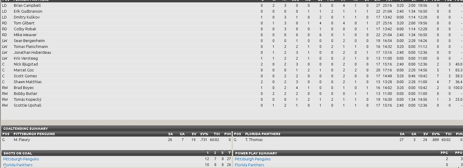 The first period is a very nice surprise, we are finally outshot for the period 12-10, but four of our shots find the back of the net! Most surprisingly the new defensive pairing result in Kulikov/Robak being a plus three for the period and Kulikov scoring just :18 into the game. (even though it's only an impossible :02 seconds after the first FLA goal...) The Penguins use the second period to storm back into the game on two goals by RW James Neal (8.0a/8.0a). The good news is we held the Pens to 7 shots on goal and we closed the shots gap to one at 19 -18. What a third period!, 16,864 fans are treated to a three goal third period and seven goals on the night! The final score is 7 - 3 and the players are mobbing each other by G Tim Thomas... There is definitely a feeling of relief among the coaches and we savor the moment before heading to the dressing room. C Shawn Matthias (6.5a/6.5a)and C Nick Bjugstad (7.0a/8.0a) both score twice tonight, while First Star D Brian Campbell (8.0a/8.0a) had two assists and a plus three rating for the evening. |