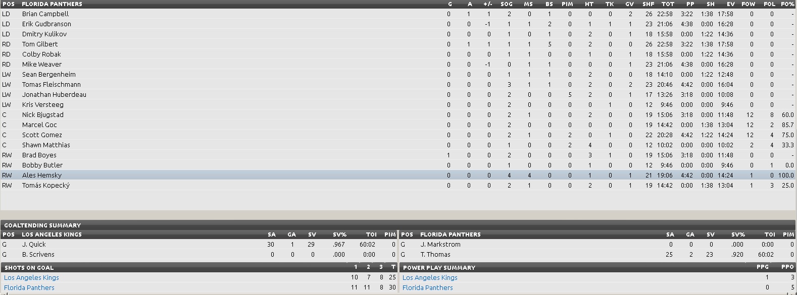 The opening lines have been set and Coach Ramsay inserts newcomer RW Ales Hemsky on the first line with C Gomez and LW Fleischmann who are the most offensively gifted and he sticks them together to see if there is any chemistry. All four lines are starting the game at equal time (15 mins) and Robak gets his second start on D while the previous set up of the top four getting 25 mins + the bulk of special teams will stay. Finally the opening faceoff puck is ready to be dropped and... After one period the Panthers are already down 2-0. Shots are nearly equal at 11-10 Panthers and Gomez is given a questionable diving penalty that led to a Kings PP goal. The 1st line is now 20 mins and the third line is down to 10 mins. Defense is reverted to Kulikov/Robak is now 2nd pair and Gubranson/Weaver are back to third pair and all three pairings are at 20 mins. the third pair remain on PP/PK special teams. The second period is definitely leaning the Panthers way as RW Brad Boyes scores an ES marker and the shot advantage grows for the Panthers to 22-17. Bonehead goes crazy when RW Dan Carcillo (7.0a/7.0a) virtually chases down and runs over LW Jonathan Huberdeau (7.0a/8.0a) to welcome him to the league. Huberdeau wastes no time and drops the gloves with Carcillo, but is clearly not in the same class as the noted pugilist. 1st Line and 4th line are given 20 min shifts and the 2 & 3rd lines have 10 mins each. Defense is same for the third period. The tightly played third period yields no goals for either team and LA skates away with the victory. Bonehead defends the play of the team in the postgame press conference. There are several questions all coming back to continued offensive troubles, when the exasperated Bonehead interrupts and points out they just scored 7 goals the last game! He further points out that the Kings are considered a top team and they held that high flying offense to just two goals. No further questions occur and Bonehead wraps up the conference. Last edited by moore4807; 01-27-2015 at 01:26 AM. |