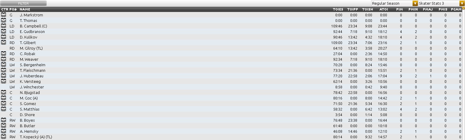 Walking in at 7:30 am Bonehead is surprised to see both defensive coaches have obviously been there at least a few hours. Questioning whats up, they say they worked out a compromise plan for the defense and want me to sign off on it. Campbell/Gilbert remains the top pair with Gudbranson/Weaver moving up to second pairing and Kulikov/Gilroy dropping to third pairing. Since both coaches agree with this plan I quickly agree to try it tonight. "Thats not all" they say They want a little extra muscle in the lineup tonight so Colby Robak will play in place of Gilroy who is our least physical D man. The minutes played will strongly skew towards the top four with Kulikov and Robak essentially spelling the top four. Again its their show I tell them. Coach Ramsay will be out today on an approved leave day. (HIPPA rules you understand) but will be there tonight, he left his changes in an envelope and I implement the changes before the morning skate. C Gomez and LW Fleischmann move to the top line, while youngsters LW Huberdeau and C Bjugstad move to 2nd line to counteract the "Crosby effect".