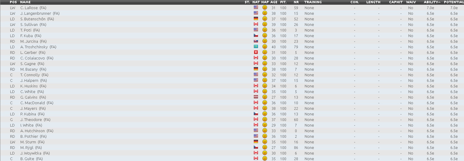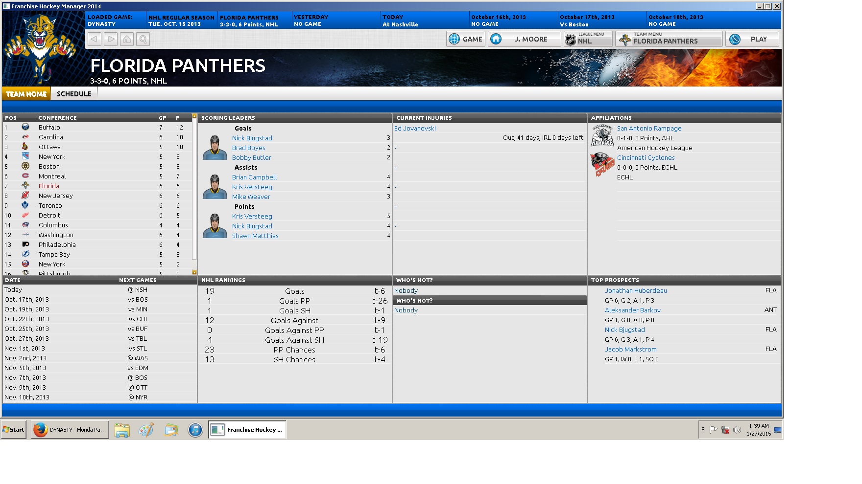 The weekly call to the owner goes well and even though the Panthers record is still a .500 winning percentage, he was happy with the close loss against LA and very happy with the blowout win against the Penguins. I update him on the players being offered as trade bait. and he cautions me that some of the deals should include draft choices to improve the future of the team. As I hang up I suddenly realize I have not actually seen the owner since the press conference introducing me. Jo reported he stopped in briefly while we were on the road but did not stay long. Hmmm... Here's the weekly stats; Last edited by moore4807; 01-27-2015 at 01:49 AM. |