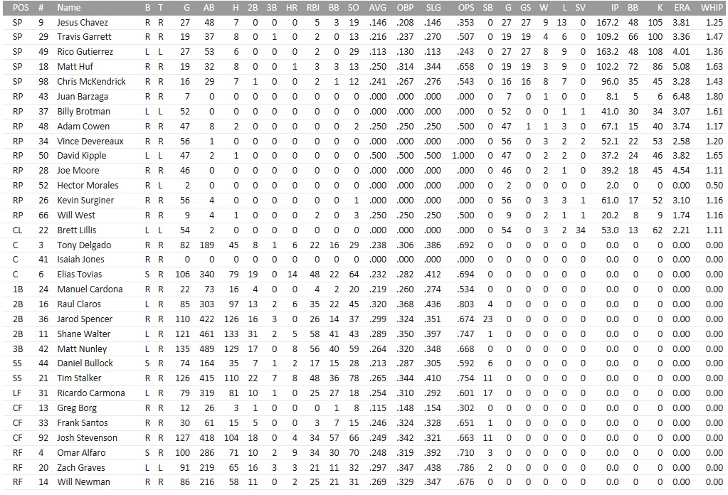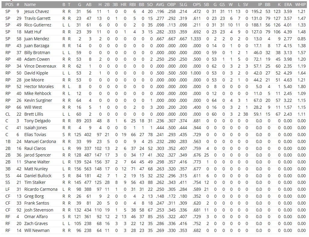 With splendid chances to lose ten games on a four-town trip, the Critters crawled into Indianapolis for a 3-game set starting on Monday, their last games on a 16-day stint without an off day. Off days would be plentiful from here on for them, with a day off every week for the rest of the month. Matt Huf better behave in his Monday start! We’d then play 18 games in 17 days to start the month of September. The Indians were ninth in runs scored and tenth in runs allowed, so pretty meh overall. “pretty meh” was still good enough to hold the Raccoons to a .333 clip in the season series, which stood 8-4 in favor of the Arrowheads. Projected matchups: Matt Huf (1-8, 5.33 ERA) vs. Brandon Smith (2-2, 4.40 ERA) Chris McKendrick (4-6, 3.41 ERA) vs. Tom Shumway (12-2, 2.58 ERA) Rico Gutierrez (7-7, 3.91 ERA) vs. Alvin Smith (5-7, 4.13 ERA) Two right-handers named Smith sandwiching Tom Shumway, the lefty; that was, if Alvin Smith could make it. He was laboring on a hamstring, not the only injury to the Indians’ staff in the last few weeks. They were also without the services of Lowell Genge, who had suffered a hand contusion on Friday and was going to take it day by day, but was not on the DL, and also without infielder Bob Reyes, although they were probably missing Genge’s .282 bat and 13 homers more than Reyes’ powerless .263 act. Game 1 POR: RF Carmona – 2B Claros – 1B Walter – 3B Nunley – LF Spencer – CF Stevenson – C Delgado – SS Bullock – P Huf IND: 2B R. Mendez – SS Janes – LF Faulk – RF C. Martinez – 1B M. Rucker – CF D. Morales – C Calhoun – 3B Rolland – P B. Smith Doubles by Claros and Nunley plated a run in the first for the Critters, with Nunley reaching 50 RBI on the season, which was cute for a team and player that had 111 games on the clock already, and one ribbie behind Shane Walter. Nunley turned a double play in the bottom 1st as well after Huf predictably walked the first Indian up, Rich Mendez, and the Critters pushed out two more runs in the second inning even despite Daniel Bullock being thrown out at home plate on Huf’s 1-out RBI single that came with Stevenson and Bullock in scoring position. Cookie’s double up the rightfield line would score Huf for the second run in the inning. While his pitching made you cringe, Huf came up with another single in the fourth inning, and again Stevenson and Bullock were on board, but this time 90 feet further back, respectively. A.J. Faulk was on the ball quickly and Stevenson was held at third base, bringing up Cookie with one out and three aboard. Cookie was batting a mind-boggling .196 with runners in scoring position and lined the first pitch into Smith’s glove for a staggering and deflating out, followed soon by Raul Claros’ pop to third base that stranded all runners. By the fifth inning, Huf had three leadoff walks on his ledger, but not only had the Indians not scored, hitting into two double plays along the way, he was also still pitching a no-hitter, technically. In actuality, Matt Huf had a hard time pitching a no-hitter, given that he regularly missed the target so grossly that an entire park full of people would hit their forehead with their palms… Mendez ended the bid with a 2-out single to rightfield, cleanly hit, nothing to complain, in the bottom of the sixth, but Erik Janes’ groundout to Nunley kept him from doing permanent damage as well. By the bottom 7th, the Coons’ 3-0 lead appeared to be overpowered by the Indians having three aboard and nobody out. Faulk had led off with a single to left, and Huf had just walked the bags full after that against Cesar Martinez and Mike Rucker. Danny Morales chopped a ball at Claros for a double play, with Faulk scoring, but Huf haplessly went on to walk Justin Calhoun as well, leading to his removal and my investigation into what kind of furniture could most reasonably be fashioned from his dead skin. Billy Brotman replaced him to face left-handed pinch-hitter Tony Ruiz, who nevertheless hit an RBI single, cutting the lead to 3-2. Since the runners moved up during defensive confusion, the Coons intentionally walked Justin Jackson batting in the #9 hole to get Brotman to face Mendez, who flew to deep right, but Cookie was on top of that ball and ended the inning. Support came from an unexpected angle in the eighth inning, in which Tony Delgado drew a leadoff walk before Daniel Bullock creamed a Brian Gilbert pitch for his second career home run, restoring the 3-run gap. LOOK AT THAT, SPENCER!! LOOK AT THAT!! … With Lillis having been battered around on Sunday, the Coons would try to patch the last two innings without him, lining up Surginer and Vince D for the job, although the save opportunity came off the board in the ninth thanks to singles by Nunley, Tovias, and Delgado plating the first in the procession. Angry at the missed opportunity, Devereaux would strike out the side in the bottom of the inning. 6-2 Coons. Nunley 2-5, 2B, RBI; Spencer 2-4; Bullock 2-4, BB, HR, 2 RBI; Huf picked up the W, but walked six batters once more. He has 6.6 walks per nine innings, which is well worse than even last year during his rookie season, when he walked “only” 5.4 batters per nine, while tossing 80+ innings in both seasons. His ERA was also up almost a full run, and his 1.69 WHIP was untenable. There were still no pitchers in AAA that would be striking alternatives… Game 2 POR: LF Carmona – 2B Spencer – 1B Walter – RF Newman – 3B Nunley – CF Stevenson – SS Stalker – C Tovias – P McKendrick IND: C Calhoun – SS Janes – LF Faulk – RF C. Martinez – 1B M. Rucker – CF D. Morales – 2B Rolland – 3B J. Jackson – P Shumway In a sign of a team held only together by matching cap insignia, McKendrick and Matt Nunley were in another’s fur as early as the first inning; Nunley first struck out with two aboard to end the top of the first, then misfielded an A.J. Faulk grounder trying to start a double play with E
