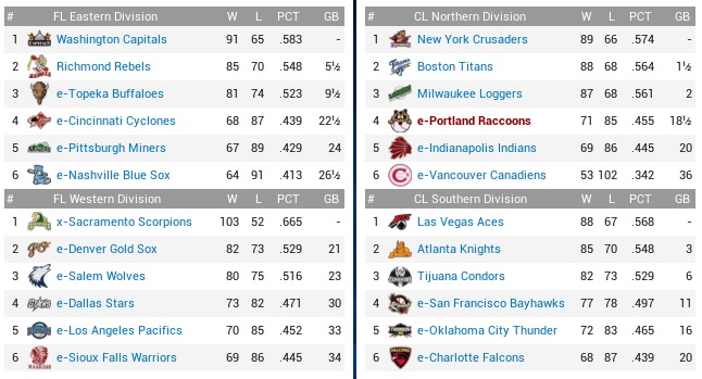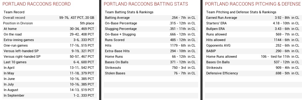 “The Portland Raccoons are brought to you by … California Waves – lard-filled pastries with no nutritional value; … Jamestown Brewery – the refreshing taste of old beer; … and Joe’s Hoes – Portland’s #1 address for gardening supplies and tools!” Raccoons (51-71) @ Crusaders (71-53) – August 21-23, 2023 Inside the final 40 games, finally, the Raccoons made their way to New York to face the Crusaders on a brief 3-day road stint. The Crusaders had a commanding 9-3 lead in the season series and had to keep winning to remain in the three-way battle for the division lead. They had allowed the fewest runs in the Continental League, but still weren’t scoring well, barely making it to the league average in runs plated. Projected matchups: Rico Gutierrez (7-8, 3.95 ERA) vs. Tim Dunn (9-8, 3.63 ERA) Travis Garrett (3-6, 3.51 ERA) vs. Ben Jacobson (5-5, 3.22 ERA) Jesus Chavez (7-12, 4.03 ERA) vs. Ed Hague (5-2, 3.32 ERA) This seris would start with two southpaws opposite the Critters, followed by the right-hander Hague. Ben “Nails” Jacobson was the rare case of a 32-year-old near-rookie that did not completely make a fool of himself. Entering the season with fewer than one year of service time (though having exceeded rookie limits), not having made a major league start, and not having appeared in relief since 2020, Jacobson had somehow put together almost as much WAR as “Tragic” Travis, Chris McKendrick, and Matt Huf combined. Game 1 POR: 2B Claros – LF Spencer – CF Stevenson – RF Newman – 3B Nunley – C Delgado – SS Stalker – 1B Santos – P Gutierrez NYC: 1B X. Garcia – 2B I. Flores – 3B Schmit – LF Loya – CF Douglas – C Rangel – RF J. Williams – SS R. Soto – P Dunn Perpetually red-faced Tim Dunn did not retire any of the first four Coons that came to the plate in the game, which would cost him two runs on Raul Claros’ infield single, Spencer’s RBI triple to center, Stevenson’s walk, and Will Newman’s RBI single up the middle before the inning fizzled out, though in that regard he was not in the only pitcher in the game that came, was seen, and conquered; Xavier Garcia ripped a leadoff jack off Gutierrez in the bottom 1st, and base hits by Ivan Flores and Lance Douglas tied the game right in the first inning. The Crusaders kept melting, though, with Dunn walking Frank Santos in the second inning. Gutierrez bunted the runner over, and Claros and Spencer both hit singles, Claros’ putting the Coons 3-2 ahead. Stevenson lined at Ivan Flores, who reached for the ball but had it dink off his wrist for a painful error that also scored a run, and Newman rolled a ball across the infield that nobody found it in his heart to make a play on, leaving the sluggish Newman with an RBI infield single, 5-2. The inning ended with Nunley, and for a nice change Gutierrez held on to the lead for more than three seconds, but Matt Nunley would partake in the ongoing deconstruction of Tim Dunn later on, hitting an RBI single in the fifth inning that chased home Josh Stevenson and ran the score to 6-2. Six runs, four earned, would be the final tally on Dunn, who was batted for in the bottom of the inning. Kyle Mims drew a 2-out walk in his place, Garcia singled, but Ivan Flores grounded out to Claros, who faced Adonis Foster in the top of the sixth and hit a single to right, his fourth single in the game in as many attempts. Behind him, Jarod Spencer hit in his second double play in his last two appearances… Not all things being sugar was also true for Gutierrez, who allowed some really hard fly balls, but the Crusaders wouldn’t hit another ball out of the park off him past the Garcia bomb in the first inning, despite f.e. in the fourth inning making nothing but deep fly outs. Gutierrez perhaps took advantage of a mostly left-handed lineup and after the early 2-spot on him pitched seven shutout innings for eight frames of 5-hit ball. But even with a 6-2 lead on the board we still had to fool around. Cory Dew entered the ninth inning with the hopes for a quick one, which he immediately dashed. Walks to Andy Schmit and Ricky Loya and no outs recorded got him evicted from the event, with Brett Lillis coming on to record strikeouts against Lance Douglas and Harvey Rangel before Jake Williams grounded out to first base. 6-2 Coons. Claros 4-4, BB, RBI; Spencer 2-4, 3B, RBI; Tovias (PH) 1-1; Newman 3-5, 2 RBI; Gutierrez 8.0 IP, 5 H, 2 R, 2 ER, 1 BB, 6 K, W (8-8); Completely out of whack, with as many walks as strikeouts and with an ERA that refused to leave the vicinity of seven, the Raccoons heavy-heartedly sent Cory Dew packing after this game, hoping he could figure **** out in AAA. Will West was called up rather than Joe Moore, who had been sent down to figure **** out more than a month ago and still hadn’t… Game 2 POR: LF Carmona – 3B Claros – CF Stevenson – 1B Walter – RF Newman – 2B Spencer – SS Bullock – C Tovias – P Garrett NYC: CF Douglas – 2B I. Flores – RF Fullerton – LF J. Williams – 3B Schmit – SS Loya – 1B Perkins – C McPherson – P Jacobson For the second consecutive game, Jarod Spencer hit a run-scoring triple in his first time at-bat, this time driving in both Shane Walter and Will Newman in the second inning, the first counters in the contest. Sadly, between Bullock (K), Tovias (U3), and Garrett (K), the Raccoons did not find it in their hearts to plate him from third base with nobody out. The Coons also wasted a Claros double in the third inning, but we don’t want to whine too much about these things, because the Crusaders shoveled runners to third base in more innings than not against Garrett and never managed to get them across home plate in the early innings. The top 4th saw the Coons’ lead increase to 3-0 in unearned fashion, Newman singling, Spencer reaching on an error, and Bullock’s grounder to Ivan Flores allowing Newman to score from third base. By the bottom 4th, “Tragic” Travis fin