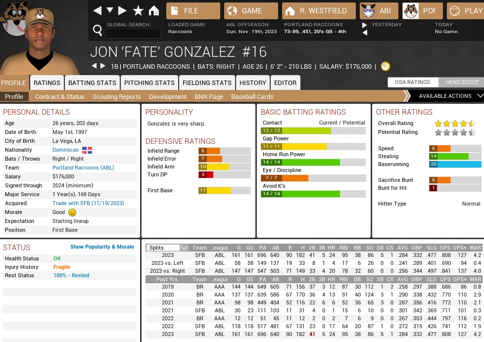 Who had that in the misery lottery even two years ago, that Jonny Toner’s contract would end and the Raccoons wouldn’t even make an honest effort to keep him around? I couldn’t yet cry more than was decent for a man my age, because a shiny new toy was literally washed ashore in Florida in November, and it was almost too good to be true. A 21-year-old right-hander had made over by boat from Cuba, and his first showcase dazzled scouts from all attending teams. Young Dan (rumored to be short for Yusneldan) Delgadillo threw a 94mph heater, and strong curves, changeups, and forkballs for utmost effect and with great precision. He had the 6’, 190lbs body of a young demigod, and a winning smile as well. No way that kid is 21 years old! No way any other team is laying their dirty paws on this gem, either. Daddy needs a new plaything! *Thankfully*, money was available. Despite their small coffers, the Raccoons had a bit over $5M to wave in players’ faces. And weren’t we looking for an additional starting pitcher anyways? Caution was advised; the Cuban right-hander that we had already around (Chavez) had sported a scouting report not quite as flashy, but he had taken until 25 and some $2M into the fire to become a worthwhile major league pitcher. And I had a hunch early on that 4-yr, $3.6M wasn’t gonna cut it for Delgadillo. Before we were going to blast $10M into one ear of a juvenile brainfart, and straight outta the other, perhaps we would be well advised to at least check out the free agent market. Despite his recent ruckus, and the injury, Jonny Toner was still graded as the highest-stuffed free agent starter on the market. There was Sam McMullen, one of numerous free agent Scorpions (so the FL West might be available this year), but he was already 35 and a type A free agent. He was a GOOD 35 though – he had won 20 games this year with a 3.14 ERA and had whiffed 203. Another option out there was Frank Kelly, who had been briefly a Coon in 2022 before being traded in early July for the Blue Sox’ Matt Huf. It was a deal that right now both teams were losing, given that Kelly had gone down to a torn UCL and Tommy John surgery before the month had been out. He had spent most of 2023 unsigned and rehabbing the wing, finally signing a deal with the Pacifics in September. He made three late starts that painted a very unclear picture of what he had to offer now. In 22 innings, he had posted a 2.86 ERA, but even BB/9 and K/9 numbers of 4.5 … small sample size, right? Well, his K/9 in Portland in ’22 had not been much higher (4.7) in five times as many innings, but at least he hadn’t walked anybody (2.5). The truth was probably somewhere in between for Kelly, who had the advantage of probably trying to rebuild value and of not having compensation attached. But, well, he pitched just as many innings as Toner the last two years combined, so you know that the cover is a lot prettier than the book between the ends. There was also ex-Coons farmhand Graham Wasserman, 33, a free agent after pitching 200+ innings five straight years for San Francisco. His stats were quite good; he had never been a flamethrower or had thrown up massive strikeout totals. He had topped 150 K only three times in a career of 9+ seasons. He was only a type B free agent, so our second-round selection would also not be spoiled by pursuing him. Yup, for a team with some coin lying around there was no reason NOT to sign an Opening Day starter off the market, because let’s be honest, between Rico Gutierrez, Jesus Chavez, and Travis Garrett I have a hard time selecting even a #3 if they’re starting behind Toner and Santos. THOSE were the times. Toner, Santos, Abe, and only on Thursday the worries start again… By the way, Hector Santos retired at age 35 after a disastrous campaign with the Rebels, who even hid him in the pen at the grisly end. He ended up with a 129-90 record and 3.19 ERA, plus 1,839 strikeouts. Probably no Hall of Famer there. I want Delgadillo. Any way I can. There was also the mild issue on the right side of the infield to repair. Well, the departure of Claros had done a lot to soften the pain there. There was nobody stopping the Critters from continuing to run out Jarod Spencer at second, and Shane Walter at first, and continuously being annoyed by Spencer. You would it consider to be feasible to find a better first baseman, at least offensively than Shane Walter, and I am talking mostly pop here. Yes, Alfaro and Tovias showed power in the second half. The spectre of Chris Beairsto is still flickering above either one of those two. I am looking for that anchor bat. Matt Nunley batting cleanup might have been one of many reasons why the Coons had the absolute worst offense in the league in 2023. Don’t get me wrong, I love Matt to bits, but he’s not a cleanup hitter. You know, the goal should be to get him into a more suitable spot. I am thinking about the #6 hole or something like that. He’d be right at home in the #6 hole. Now, Tovias hit the most homers, but his swing as a few gross holes. He’ll be 24 next year, all of this can still get better. Alfaro could bat ahead of Nunley. Adjusted for the time he missed on the DL or shared space with other outfielders in the first half of the season, he had slightly more homers per exposure than Tovias, and a higher average. Nah, I’m looking for that true #4 bat. Good average, monster power. I’ve been looking for that guy ever since the Duke Smack era ended, and no, Hugo Mendoza was never my guy. He could never do well enough for my expectations. Is Jon Gonzalez that type of player? He batted .288 with 70 extra-base hits, including 24 dingers, for the Bayhawks this year in what was his first full season in the league, having turned 26 in May. The power is real, and the best thing of all might be that the Bayhawks didn’t outright flip me off and are actually ready to talk. The problem is that they are exclusively after pitching and hav