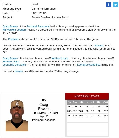 Raccoons (83-47) @ Thunder (67-62) – August 27-29, 2007 The Thunder were right about average in both offense and pitching, with a -3 run differential. The Raccoons came in with 555 runs scored (9th) and 444 runs allowed (1st), which was kinda wicked. We are 4-2 against them on the year. Projected matchups: Cássio Boda (5-3, 3.74 ERA) vs. Aaron Anderson (11-5, 3.99 ERA) Raúl Fuentes (9-9, 4.25 ERA) vs. Manny Guzmán (9-9, 4.77 ERA) Nick Brown (14-7, 2.47 ERA) vs. Luis Martinez (8-12, 3.62 ERA) I said before that the open slot in the rotation would fall on Thursday. Well, I can’t even count to five correctly, which might be one reason the team has blown its huge late-June lead. Brownie will go on short rest regardless, despite throwing 110 pitches in his last start. I just don’t really feel like jumbling roster spots in the final days of August. Game 1 POR: SS Flores – 1B Quebell – CF Castro – LF Pruitt – RF Black – C Bowen – 3B Sharp – 2B Nomura – P Boda OCT: LF V. Sanchez – 1B T. Cardenas – RF Takizawa – CF W. McCormick – SS M. Garza – 2B Michel – 3B S. Walker – C L. Paredes – P A. Anderson The Coons got singles from their first three men up, loading the bases, before letting the old veteran Anderson, who had recently overtaken Woody Roberts for most wins in ABL history with 281, largely off the hook. One run scored on Pruitt grounding to second for a fielder’s choice before Hack blacked out. Craig Bowen sent a drive to deep left center that Victorino Sanchez - … well, I don’t know how he got it. Guy must have a jet pack hidden under the uniform. There was no such advantage for Luke Black, who could not get to Sanchez’s soft floater in the third inning, giving Sanchez an RBI double to tie the game and also an 18-game hitting streak. Anderson then cracked in the top of the fourth. After Pruitt made the first out, Black walked, setting off a chain of lucky events. Bowen had a blooper drop between Michel and McCormick in shallow center for a single, and Sharp walked on a close ball four. Yoshi and Boda both sent soft singles into center to score single runs before Vic Flores’ 2-run double into right really broke the score open. After a while, Anderson logged another out on Quebell’s sac fly, but that was it for him, leaving down 6-1. The Coons made it 7-1 on Castro’s single and 11 Critters came to the plate in total. Boda coldn’t quite slam the door on the Thunder in that situation. They got him for a run in the bottom 4th, then left two on base when Pruitt shagged two hard drives in the fifth, and stranded another pair in the sixth when Steven Walker and Luis Paredes drew a pair of 2-out walks, but were left on by Alberto Rangel grounding out to Flores. Reliever Kevin Cummings allowed an add-on run in the seventh. After the Oklahoma bullpen had retired nine straight, the Duke rediscovered his stroke and bashed Cummings for his 26th home run of the year, a solo job that gave the Critters an 8-2 lead. But even a 6-run lead could be an adventure. Sergio Vega was expected to give us the bottom 8th, but very didn’t. Marcos Garza and Samy Michel singled, and then he walked … well, Walker. No outs, three on. Marcos Bruno replaced him, struck out Paredes and PH Kurt Metting, before Victorino Sanchez, who might well be the best batter in the CL (.360/.466/.524) battled out a walk to shove home the Thunder’s third run. Sharp caught a foul pop by Cardenas to end the frame. The relief didn’t get better in the bottom 9th, though. Kaz Kichida was in, and allowed three singles for a run, logging only two outs. Enough with the fudging! Angel Casas whiffed Paredes to put this one in the books for good. 8-4 Coons. Flores 2-5, 2B, 2 RBI; Castro 2-5, RBI; Bowen 2-3, BB, 2B; Boda 6.0 IP, 6 H, 2 R, 2 ER, 3 BB, 4 K, W (6-3) and 1-3, RBI; The shallow end of our bullpen is very shallow. Elsewhere it was NYC 10, LVA 5, so our lead remained at one game. Santiago Trevino rejoined us off the DL, replacing Jose Cruz on the roster. Cruz got only into two games, with one at-bat (a single), and fielding one inning in this game here after a double switch that took out Matt Pruitt late. Game 2 POR: SS Flores – 1B Quebell – CF Castro – LF Pruitt – RF Black – C Bowen – 3B Sharp – 2B Nomura – P Fuentes OCT: LF V. Sanchez – 2B Metting – CF J. Gonzales – 1B T. Cardenas – SS S. Walker – C L. Paredes – RF Rangel – 3B Arreola – P M. Guzmán After stranding a pair in the first, the Raccoons took a 1-0 lead in a wicked third inning, which started with a Fuentes single escaping Walker before Vic Flores got pitched in a little bit too tight. Quebell erased him right away with a double play, but that left Fuentes had third, who scampered home on a wild pitch before Castro could single. Both teams killed a promising start to their halves of the fourth with a double play before a 2-out triple by Rangel in the bottom 5th got the tying run to within 90 feet. Since Ignacio Arreola batted left-handed, Fuentes went after him, got him to 1-2, then surrendered a fly to deep center, but Castro was on his horse in due time to catch it. We then added our second run in the sixth on singles by Quebell, Pruitt (which was actually touched by Cardenas, but was hit too hard to be contained), and Black (just past the reach of Arreola), only for a so far 0-for-2 Sanchez to extend his streak to 19 games in the bottom 6th with a hard line drive single to right, and Kurt Metting to tie the game with a home run to left center. The next inning, Fuentes was again pitching to Arreola with two outs and a man on third, got to 0-2, then allowed an RBI single. Garza and Sanchez also reached base safely to load them up, with Law Rockburn appearing to face Metting, but the Thunder countered with lefty Wes McCormick. It was the Thunder’s time to erupt. McCormick and Jorge Gonzales both drove in pairs with hard hits to sink the Raccoons and send their GM into another bout of