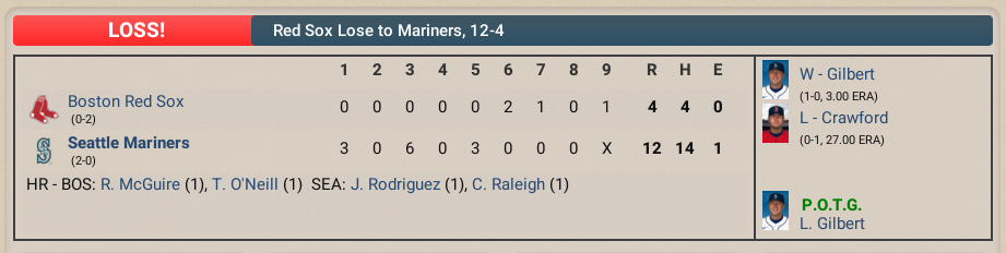 Well that did not go well for us. On a day that saw the Mariners put up 12 runs on 14 hits, the Boston pitching staff could not stop the bleeding. The Seattle Mariners (2-0) thumped the Boston Red Sox (0-2) by a 12 to 4 score.