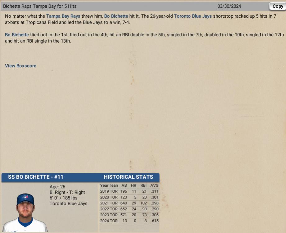 It took extra-innings, but Toronto Blue Jays SS Bo Bichette pounded out 5 hits in 7 at-bats in the 7 to 4 win over the Tampa Bay Rays. On the day, Bichette knocked 3 Singles and 2 Doubles with 2 RBI to lead his team to victory.