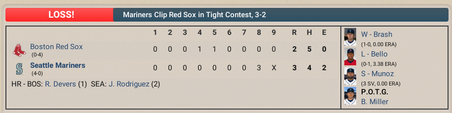 A different day but same result; a loss. Despite getting runners on base, the visitors just could not score runs to keep things competitive. The end result was the Seattle Mariners (3-0) topping the Boston Red Sox (0-3) by a 4 to 1 score.