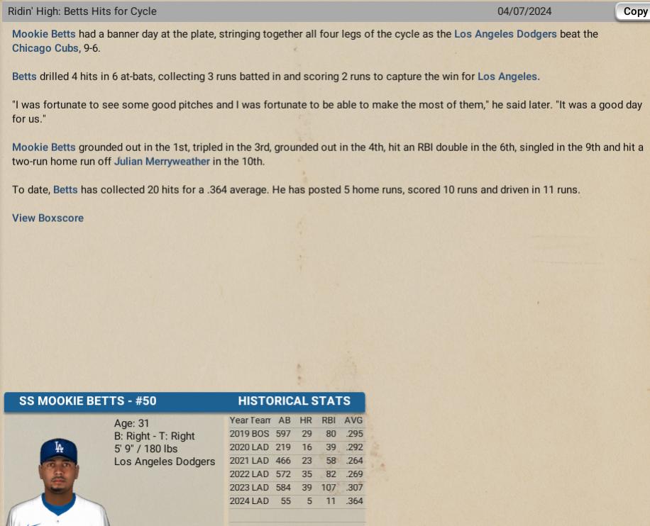 Los Angels Dodgers All-Star Mookie Betts had a big day in his team's 9 to 6 win over the Chicago Cubs as he hit for the cycle. On this special day, Betts went 4 for 6 with 2 Runs and 3 RBI.