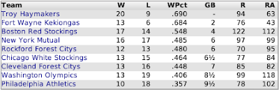 After the Lousiville club folded, Boston moved quickly to sign young Johan Moody. With the addition of Moody to batsmen Isiah Kershaw (.351, 15 doubles, 51 runs), Mustard Jackman (.310, 15 doubles, 24 stolen bases, 47 runs), and Jay Cason (.337, 49 runs), the Bostons easily scored the most runs in the league. And after winning their first six games, they appeared set to run away with the championship.
