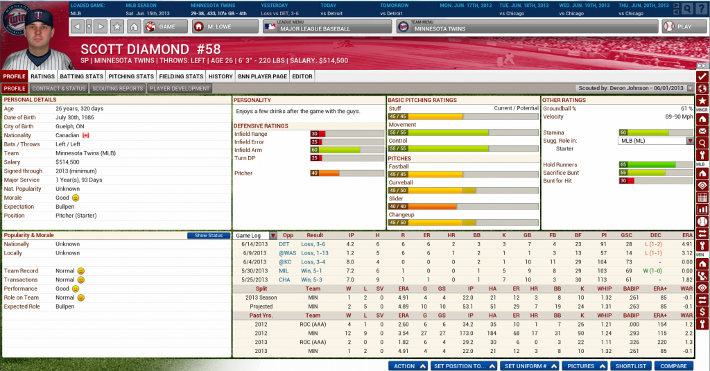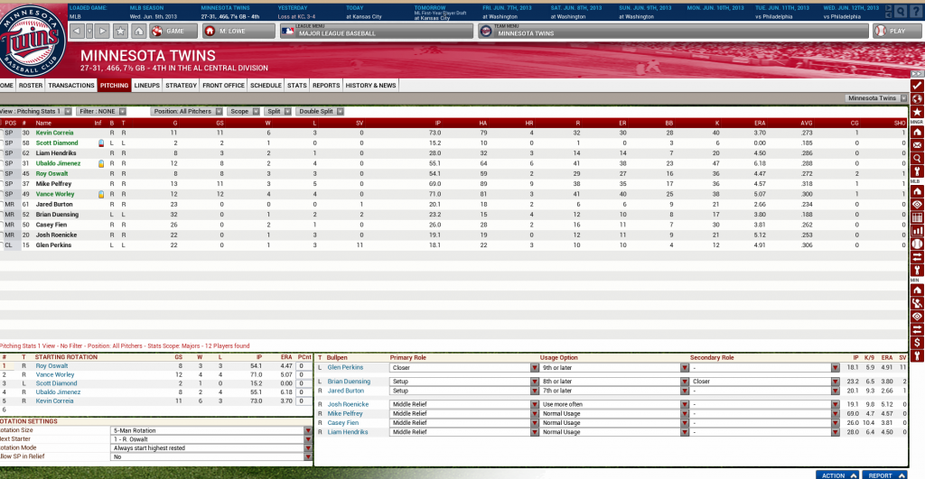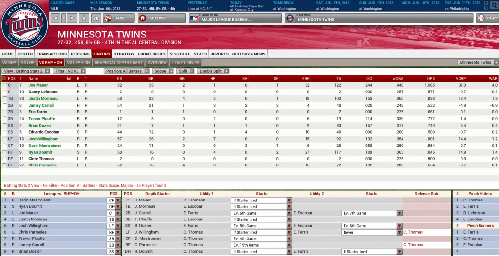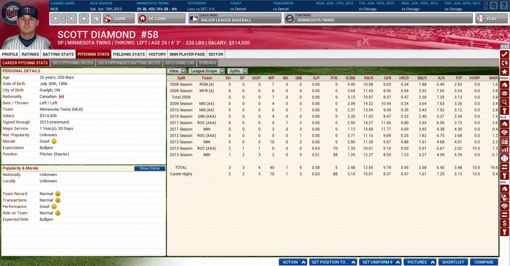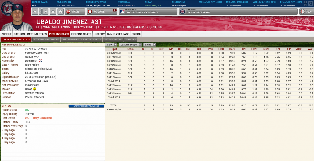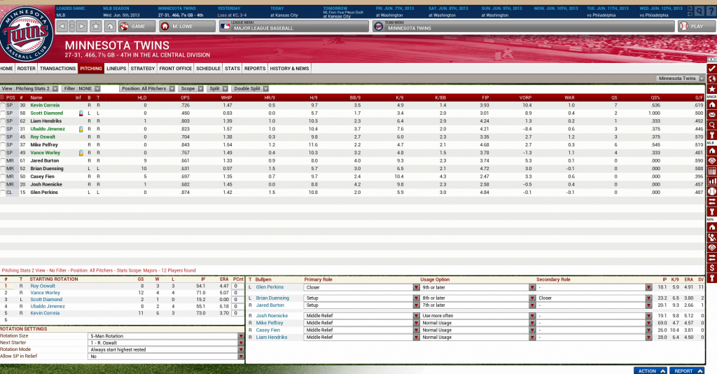 A Potential MVP, and Pitching I thought a fun place to start this dynasty would be on the eve of the 2013 draft, in which the Minnesota Twins hold the 4th overall pick. I've watched every single game thus far, and actually started the year controlling the intricacies of the MLB club and handling the team, in-game, "from the dugout." Around the middle of May, I decided that it would be best to let Gardenhire do his thing, and have only meddled a bit since then. The team currently sits at 27-31, having just blown a 3-0 lead in the 9th inning to the Royals to lose 4-3 (Perkins' 3rd blown save, 2nd this week). We're 7.5 games behind the Chicago White Sox for the division lead (Detroit is 2 games back), and we're 6 games out of the Wild Card. Joe Mauer appears to be the league MVP thus far, with league leading stats of .369 average, 1.075 OPS, and a 4.1 WAR. He also had a 15 game hitting streak at one point during the year. Going into the season, I thought the Twins' biggest area of concern was starting pitching, so I immediately offered 35 year old free agent Roy Oswalt a 1 year, $4.6M contract. At the very least, I wanted someone at the top of the rotation who could give us some quality innings to help out the bullpen, which to me looked pretty decent actually at the start of the year, especially the back end with Burton (setup) and Perkins (closer). Oswalt signed a few days later. I also ended up claiming Ubaldo Jimenez from Cleveland who while getting roughed up while with Cleveland, has pitched well with Minnesota thus far (2.64 K/BB ratio, 0.29 HR/9, 2.91 FIP). We've had a couple players go between AAA and MLB, but here is how the current pitching staff is looking today as well as their stats: ![]() And their advanced stats (which I use more than anything): ![]() Some other pitching tidbits: Scott Diamond, recently called up from AAA, has started two games (15.2 innings) and has yet to give up a run. Next up, I'll get into some of the details of the lineup, sim the games for June 5-6, and then the draft. Last edited by Mike Lowe; 11-11-2013 at 10:01 AM. |