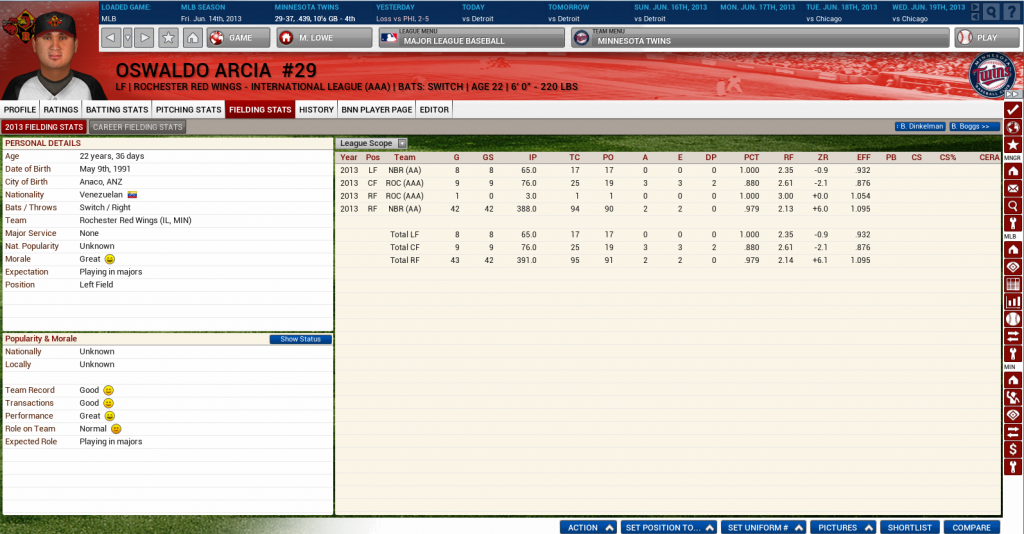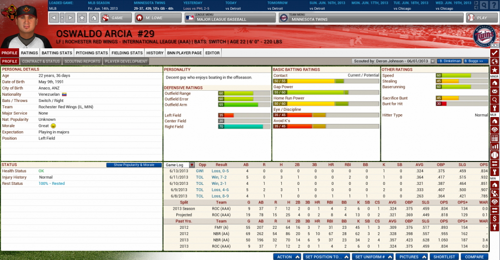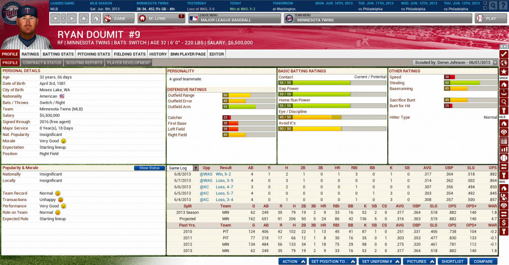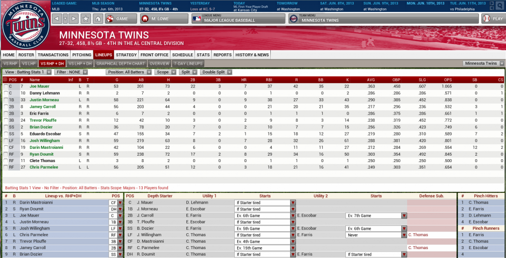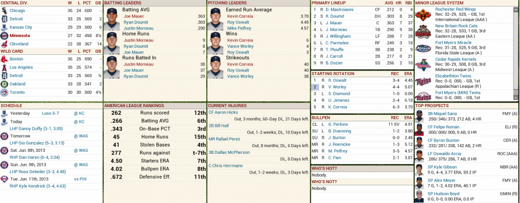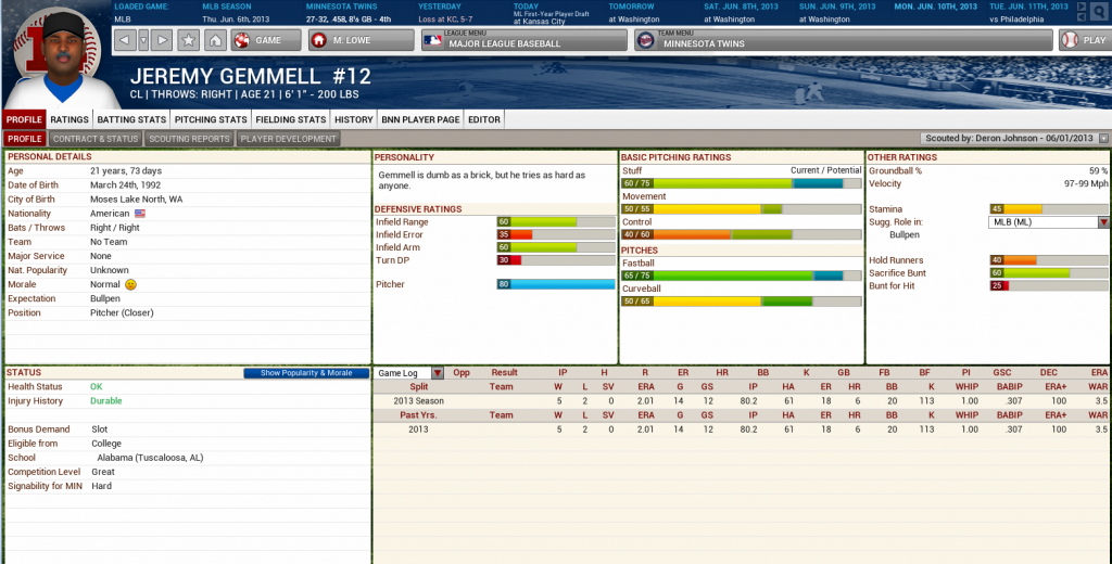 A Potential MVP, and Pitching I thought a fun place to start this dynasty would be on the eve of the 2013 draft, in which the Minnesota Twins hold the 4th overall pick. I've watched every single game thus far, and actually started the year controlling the intricacies of the MLB club and handling the team, in-game, "from the dugout." Around the middle of May, I decided that it would be best to let Gardenhire do his thing, and have only meddled a bit since then. The team currently sits at 27-31, having just blown a 3-0 lead in the 9th inning to the Royals to lose 4-3 (Perkins' 3rd blown save, 2nd this week). We're 7.5 games behind the Chicago White Sox for the division lead (Detroit is 2 games back), and we're 6 games out of the Wild Card. Joe Mauer appears to be the league MVP thus far, with league leading stats of .369 average, 1.075 OPS, and a 4.1 WAR. He also had a 15 game hitting streak at one point during the year. Going into the season, I thought the Twins' biggest area of concern was starting pitching, so I immediately offered 35 year old free agent Roy Oswalt a 1 year, $4.6M contract. At the very least, I wanted someone at the top of the rotation who could give us some quality innings to help out the bullpen, which to me looked pretty decent actually at the start of the year, especially the back end with Burton (setup) and Perkins (closer). Oswalt signed a few days later. I also ended up claiming Ubaldo Jimenez from Cleveland who while getting roughed up while with Cleveland, has pitched well with Minnesota thus far (2.64 K/BB ratio, 0.29 HR/9, 2.91 FIP). We've had a couple players go between AAA and MLB, but here is how the current pitching staff is looking today as well as their stats: ![]() And their advanced stats (which I use more than anything): ![]() Some other pitching tidbits: Scott Diamond, recently called up from AAA, has started two games (15.2 innings) and has yet to give up a run. Next up, I'll get into some of the details of the lineup, sim the games for June 5-6, and then the draft. Last edited by Mike Lowe; 11-11-2013 at 10:01 AM. |