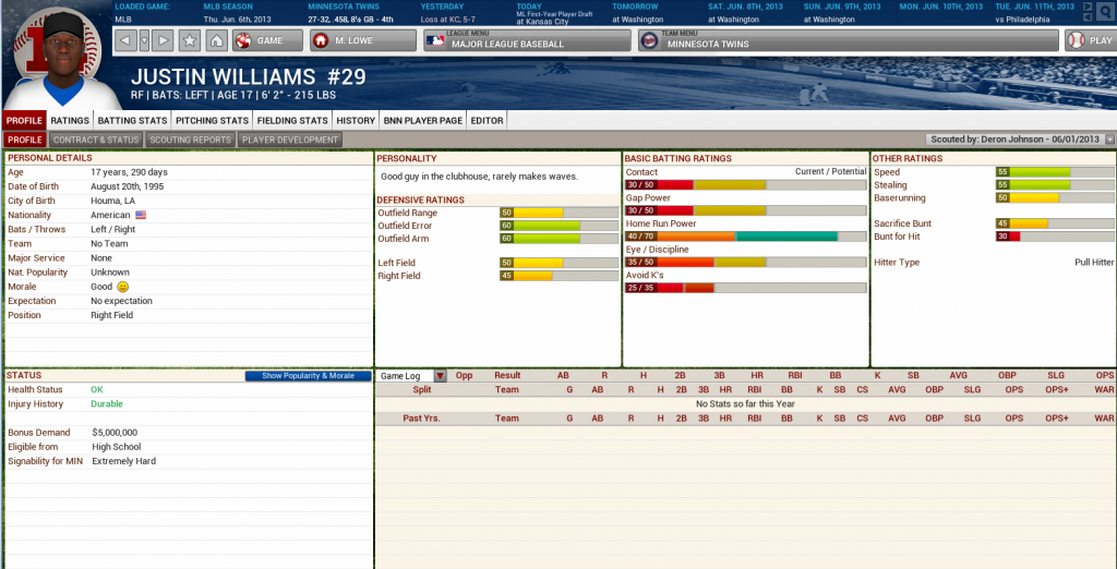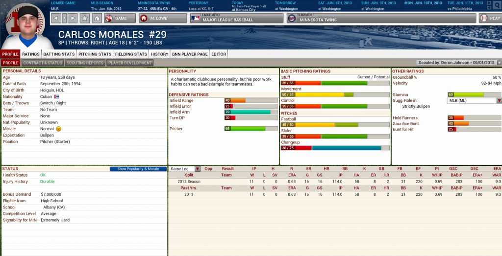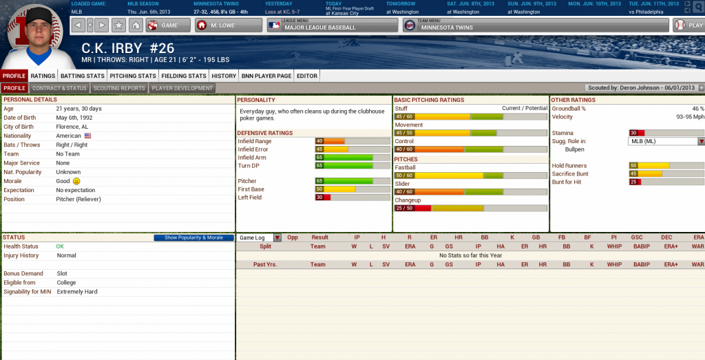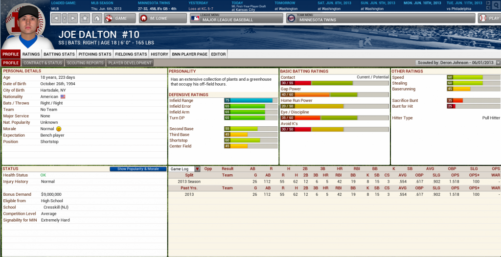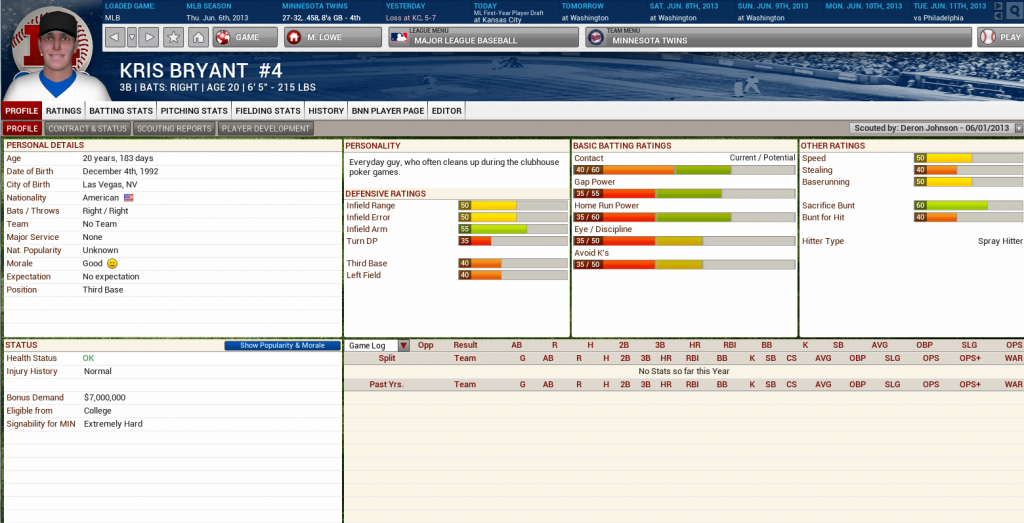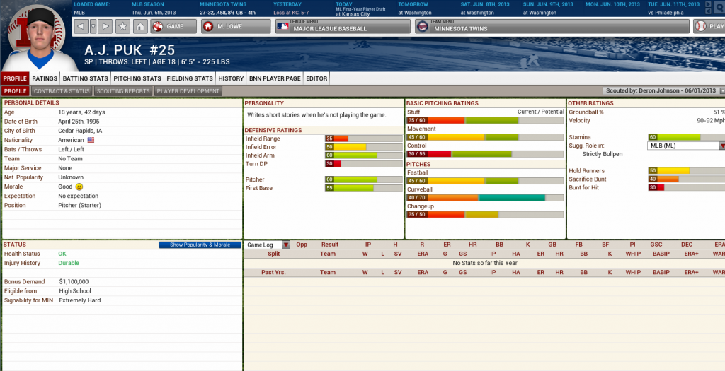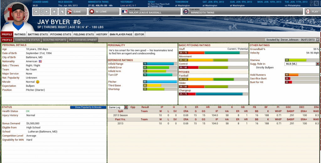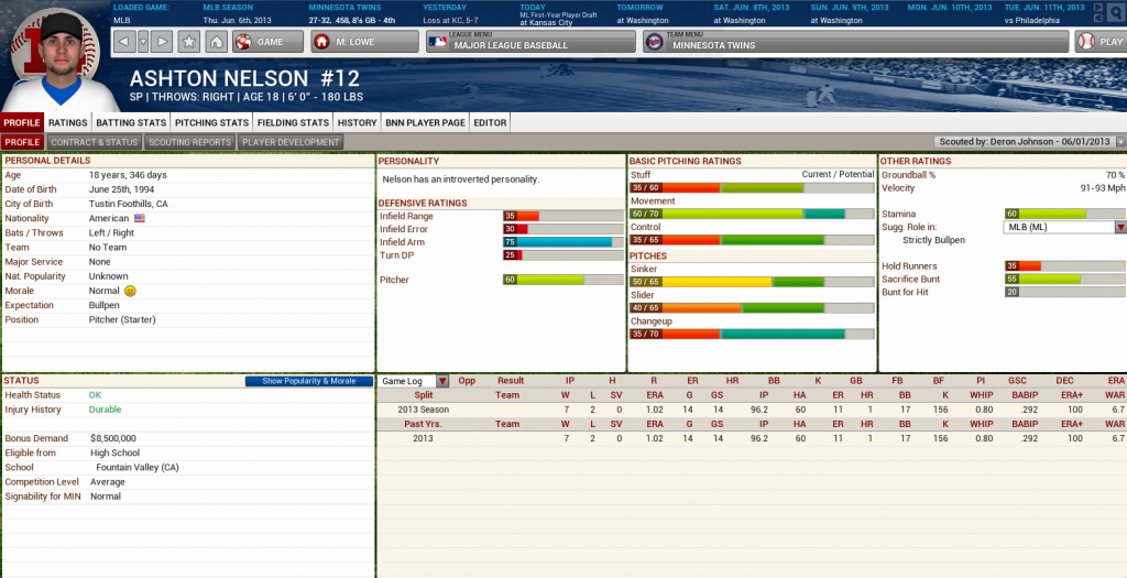 2013 MLB Draft (top 5 selections) 1st Pick Overall - Houston Astros ![]() 2nd Pick Overall - Chicago Cubs ![]() 3rd Pick Overall - Colorado Rockies ![]() 4th Pick Overall - Minnesota Twins ![]() 5th Pick Overall - Cleveland Indians ![]() I really feel like OOTP has finally captured the makings of a competitive draft as all of these guys were on my board. Dalton and, Nelson, and Blyer were all guys I liked a lot. Morales I like, but his attitude seemed problematic. Other than that, I'm happy with the pick. The one challenge is that Minnesota has $7.5M to sign their draft picks