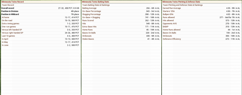 Team Batting Stats (and Gardenhire's lineups/depth) I'm now 13 rounds into the draft and as promised, here are some more screens, starting first with team batting: ![]() Team Batting Stats Cont. ![]() Team Overview ![]() Team Stats ![]() Next, up the top 5 picks in the draft, followed by Minnesota's top 5 picks. Last edited by Mike Lowe; 11-11-2013 at 10:05 AM. |