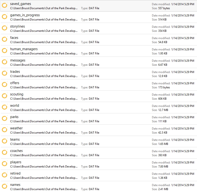 ). I created a test manager note and immediately ended the game without doing anything else.Then I went to Windows Explorer and searched the entire OOTP game folder for all files that were created and modified today. They were nearly all .dat files. This seems to indicate that the note is imbedded in one of them. In case you are curious, the list of these files that changed is shown below. Oddly, the only two non-.dat files that changed were bookmark_page_links and recent_page_links, both in the league's \Documents\Out of the Park Developments\OOTP Baseball 14\saved_games\ABA.lg\page_links folder. I looked into these two files with Notepad and saw some references to my manager, his home page, and recent pages visited (interestingly, the most recent was Manager Notes) but the rest was hieroglyphics.