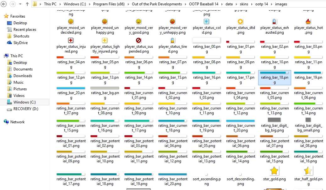 That said, you could try finding the corresponding ratings bar images in OOTP12 and copying them to the images folder for the skin that you are using in OOTP14. Make sure that they are named exactly the same. Delete skin.bin and restart OOTP14 and hope for the best. I think you'll get errors, though. In that case, you'll need to download your skin from Add-Ons Central and reload it.