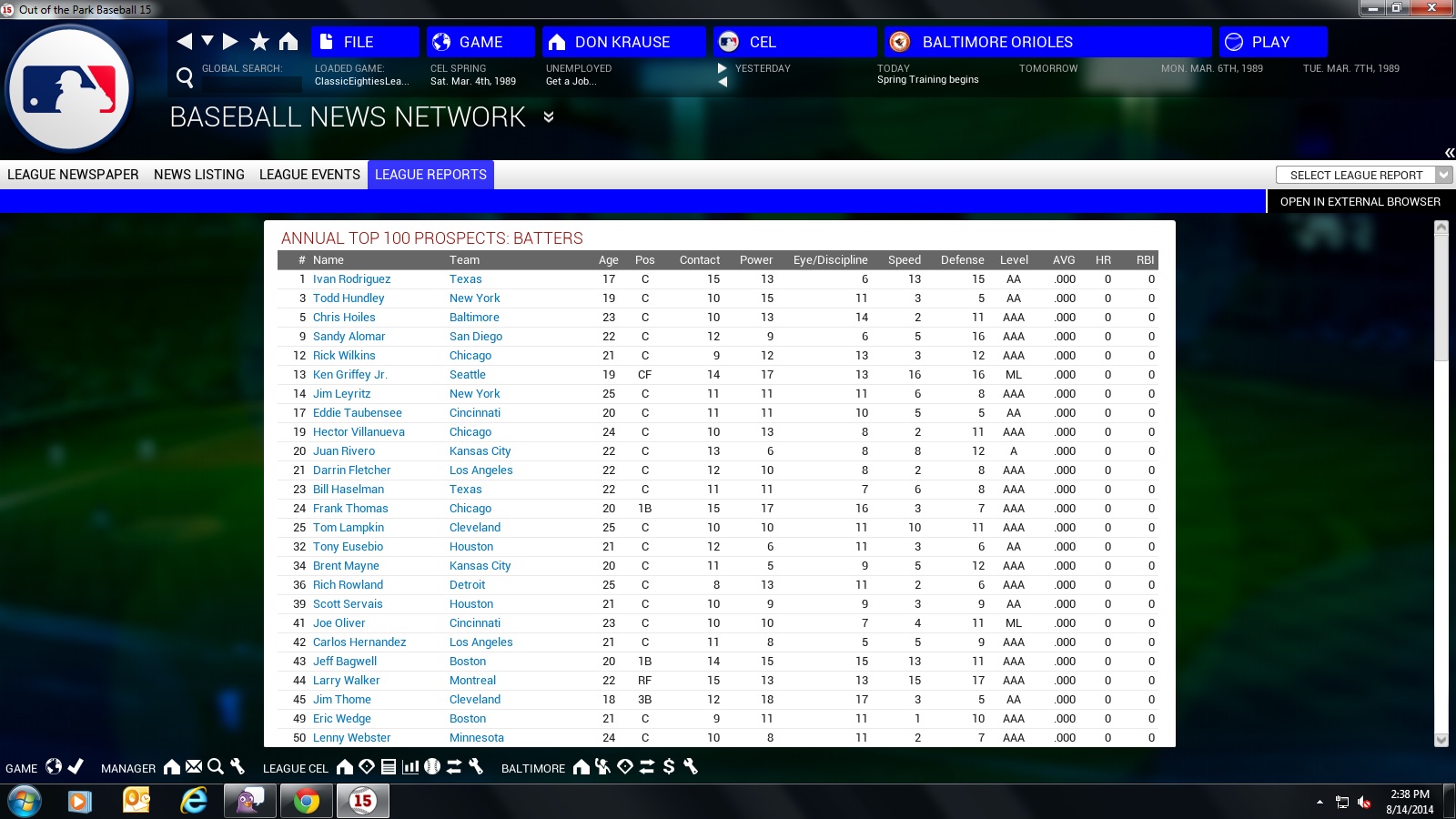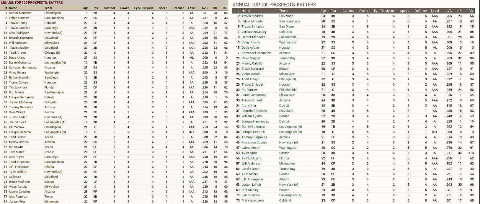 This is the top 100 prospects from the same file in OOTP 14. I have edited ratings between exporting from 14 into 15, but by and large the ratings match the hitting prospect order you might expect, unlike the ootp 15 prospect order of many mediocre catching prospects ahead of Bagwell, Griffey, Thomas and company.