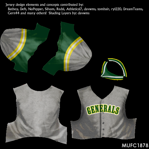 I’m looking for uniform and cap for my fictional league which is expanding. The league is centered around all teams having green and yellow as their colors. The logos are being worked on (thanks Justafan), could someone help with the rest.