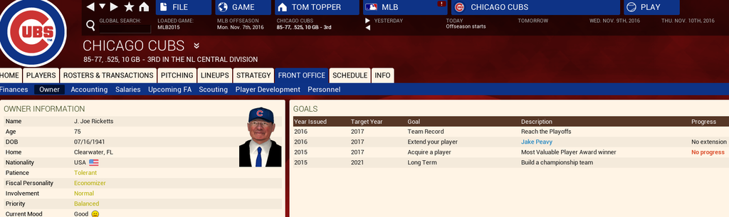 I read this year's owner goals (playing as GM only) with a laugh. Extend Jake Peavy - umm that same guy who has played in 6 games in a year and a half with us because he's always hurt? The same guy whose scouting summary is "I'll be surprised if he is still pitching in organized baseball a year from now?"