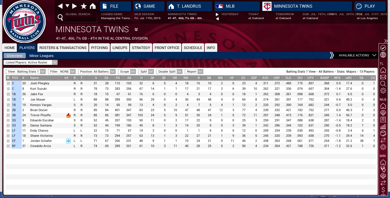 This is the other dynasty idea I’ve had—taking my hometown Twins and managing them back to the World Series. I expect it to take several seasons to just get back to the playoffs, making the World Series likely will take another couple of seasons. Owner goals for this season for the GM are: • Don’t suck completely • Upgrade shortstop • Extend Torii Hunter • Build up team to reach the playoffs. April 6, 2015 • Before the game, GM Terry Ryan dealt back-up C Josmil Pinto and 18-year-old Danny Feliz (RHP RP) to Boston for OF Shane Victorino and $3 million. • C Chris Herrmann was called up from AAA to replace Pinto, with 1B Brock Peterson being sent down. • Also before game play, Colorado sent 1B Justin Morneau to Houston for RHP RP Scott Feldman, SS Nolan Fontana, and $3 million. Minnesota 3 at Detroit 4 WP: Tom Gorzelanny (1-0), LP: Brian Duensing (0-1), SV: Joe Nathan (1) HR: MN-Oswaldo Arcia (1), Det-Miguel Cabrera (1) Interestingly Detroit decided to send Anibal Sanchez to the mound on opening day instead of aces David Price or Justin Verlander. Arcia hit a 2-run inside-the-park homer to right to open the scoring in the 4th. A 1-out walk by J.D. Martinez in the 4th was Detroit’s first baserunner. Ian Kinsler broke through for Detroit’s first hit with 2 outs in the 5th. Detroit finally managed to score in the 7th on a wild pitch after an errant throw by Danny Santana. Cabrera’s 2-out, 3-run homer off of Duensing in the 8th gave Detroit their first lead at 4-3 wasting a beautiful performance by Phil Hughes (7 IP, 2 H, 1 R, 0 ER, 1 BB, 7 K) • Adam Jones (Baltimore) out 5 weeks with a fractured thumb when HBP. April 7, 2015 Off Day • Seattle sends 2B Rickie Weeks and RHP CL Jeremiah Muhammad to the Chicago Cubs for C Miguel Montero. • Detroit trades 1B Victor Martinez and $3 million to Baltimore for RHP SP Bud Norris and 3B Jomar Reyes. April 8, 2015 Minnesota 3 at Detroit 4 WP: Joakim Soria (1-0), LP: Casey Fien (0-1), SV: Joe Nathan (2) HR: MN-Shane Robinson (1), Brian Dozier (1), Det-Yoenis Cespedes (1) CF Anthony Gose was injured (shoulder soreness, 3-4 weeks) catching a Oswaldo Arcia flyball on the warning track to end the 2nd. Robinson hit a solo shot for my first hit with 1 out in the 3rd to open the scoring, Dozier added a 2-run shot later in the inning. Detroit finally strung some hits together to get on the board and chase Kyle Gibson in the 7th. Cespedes’ 1-out, 2-run homer off of Fien in the 8th gave Detroit a 4-3 lead and had me feeling like I was watching a bad replay of the opener. • C.J. Wilson (L.A. Angels) threw a 5-hit shutout against Seattle. April 9, 2015 Minnesota 7 at Detroit 8 WP: Justin Verlander (1-0), LP: Ricky Nolasco (0-1), SV: Nathan (3) HR: MN-Oswaldo Arcia (2), Eduardo Escobar (1), Det-J.D. Martinez (1) Trying to avoid a sweep and wake up a slumbering offense against Justin Verlander seemed to be an overwhelming task. A 34 minute rain delay in the bottom of the 4th was shortly followed by Detroit getting on the board on a 2-run single by Jose Iglesias. Ian Kinsler was injured (strained hamstring, 2 weeks) robbing Brian Dozier of a RBI single in the 5th diving to snare a line drive to end the inning. I finally got on the board in the 6th on a GIDP by Trevor Plouffe to make it 1-3. A grand slam by Martinez in the 7th seemed to put the game out of reach, but I rallied for 5 runs in the 8th to claw back within 6-7. The highlight of the rally was a 3-run homer from Arcia. Nick Castellano’s 5th hit of the game brought home an insurance run for Detroit. That run proved big after Escobar homered off of Nathan in the 9th. April 10, 2015 • Jesse Chavez (Oakland) out 9 months with a partially torn ulnar collateral ligament • Jedd Gyorko (San Diego) out 5-6 weeks with a hamstring strain Minnesota 5 at Chicago White Sox 9 WP: John Danks (1-0), LP: Tommy Milone (0-1), SV: Javy Guerra (1) HR: MN-Shane Victorino (1), Danny Santana (1), Joe Mauer (1), CWS-Conor Gillaspie (1) After the White Sox scored a pair in the 2nd, Victorino tied the game on a 2-run homer in the 3rd. Santana hit a solo homer later in the inning to give me the lead. Gillaspie hit a 1-out, 2-run homer in the bottom of the inning to give the White Sox the lead back. My bullpen’s early season struggles continued. April 11, 2015 Minnesota 6 at Chicago White Sox 7 WP: Dan Jennings (1-0), LP: Brian Duensing (0-2) HR: MN-Danny Santana (2), Brian Dozier (2), CWS-J.B Shuck (1) Santana’s homer leading off the 3rd opened the scoring. A 2-out, 2-run homer an inning later by Dozier extended the lead. The White Sox finally got to Mike Pelfrey in the 6th, capped by a grand slam from Shuck to take the lead. A 2-run single by Oswaldo Arcia off of closer David Robinson tied the game, but the White Sox got a walk-off single from Jose Abreu to win it. April 12, 2015 Minnesota 3 at Chicago White Sox 2 WP: Phil Hughes (1-0), LP: Erik Johnson (0-1), SV: Glen Perkins (1) HR: MN-Jordan Schaffer (1), Trevor Plouffe (1), CWS-None Schaffer led off the 3rd with a homer to open the scoring. The White Sox finally got to Hughes in the 5th stringing together a rally that produced 2 runs and gave them the lead. Plouffe answered with a 2-out, 2-run homer in my next at bat to retake the lead. The bullpen didn’t let me down finally after Hughes turned in another solid outing. • Danny Duffy (Kansas City) threw a 2-hitter against the L.A. Angels. April 13, 2015 • We’re 28th in the latest power rankings Kansas City 2 at Minnesota 0 WP: Yordano Ventura (1-1), LP: Kyle Gibson (0-1), SV: Greg Holland (2) HR: KC-None, MN-None Kansas City got on the board first in the 3rd on a double by Alex Rios. Pitching dominated the game as we only managed 4 hits off of Ventura before Holland struck out the side in the 9th. Gibson only allowed 5 hits in 6 innings before the bullpen held the Royals to 2 hits in 3 innings. April 14, 2015 Off Day • Edwin Encarnation (Toronto) out 3-4 weeks with a sprained ankle 
