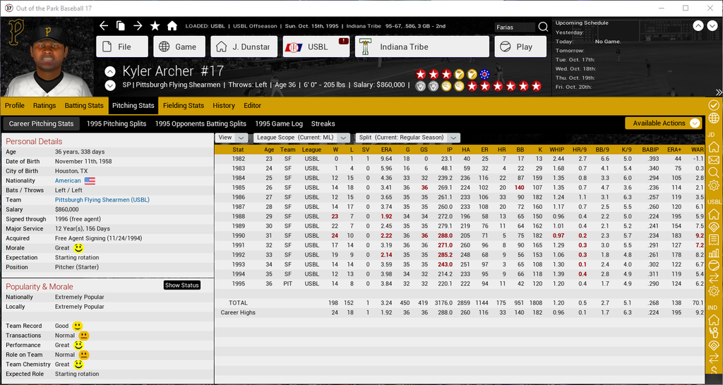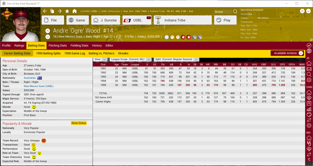 SCOTT RICH is probably going to end his career as the greatest hitter in the history of the USBL. Only ten seasons into it, and he already has over 500 home runs! ![]() ANDRE WOOD may challenge him if he continues doing what he's been doing, though. He just won the Triple Crown in 1995. ![]() LUIS CAMPOS is winding down now, but is still the all-time USBL leader in HR and RBI. Oddly enough, however, he's never led the league in home runs in any season. ![]() BRAD MOORE just retired. For a time, he was the all-time USBL HR leader. He's sure to be a first-ballot HOFer, despite sticking around for a few seasons too long. ![]() LUTHER MCCARTHY is another guy with over 500 HR, and another surefire future HOFer who shows few signs of slowing down yet at 33. ![]() JOSE GAVILANEZ is the all-time hits leader, and at his current pace, has a good shot at becoming the first USBL player with 3,000 career hits next season. ![]() Good pitching has been a bit harder to find over the 16-season history of the USBL, but there have been a few. KYLER ARCHER is set to pass Ronald O'Neill's all-time wins record (213) next season. He just finished his first season in Pittsburgh after a solid run in San Francisco that saw him win two Best Pitcher awards. ![]() QI-CHEN JIANG just retired after a fine career that saw him make eight All-Star squads and finish third behind O'Neill and Matt Barber in all-time wins. ![]() CESAR FARIAS is by far the greatest reliever in USBL history. His pursuit of 600 saves was derailed as he missed the entire 1995 season with an injury, but he should come back strong next year. He's never missed an All-Star game when healthy. He is still the only reliever to win the Pitcher of the Year award.