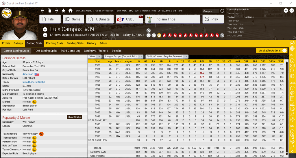Manuel Casdenito has been a mainstay of the league since its inception. He just turned 40 years old. On September 3, 2013, he became the first player in the APL to reach 3,000 hits. He currently sits at 3,014. The closest player is a 37-year-old active player with 2,566. Casdenito has won the league championship five times with two different teams. ![]() ![]() Casdenito started as a 22-year-old center fielder for the 1996 Colorado Rapids, where he logged the first of three consecutive batting titles, in addition to winning the MVP in '97. The Rapids won the APL title in '97 and '98. The Rapids let him walk and he signed a four year deal with the Chicago Firebirds, where he picked up another batting title and MVP award in 2001. The Firebirds moved him to the infield, where he primarily played second base. The Firebirds also let him walk, and he wound up signing two long term deals for a total of 9 years with the Texas Twisters (subsequently rebranded to the Dallas Vaqueros). He initially split time between second and third base, but eventually made a more permanent transition to right field. The Twisters won three consecutive league championships in 2003-2005. Casdenito racked up three more consecutive batting titles in 2006-2008. He's played the last two years with the Salt Lake City Bees, though he missed almost half the 2013 season due to various injuries. He's now a free agent. If he plays further, he's going to have to play first base (no DH). His batting ratings are still decent (13/11/9/14/12 -- out of 20).