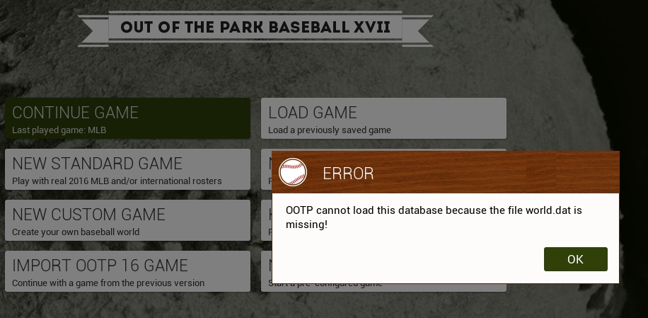Every once in a while, after applying a patch, you get that "World.dat" file is missing" message (first screen print), followed by a sinking feeling. Not to worry, if your league files are still in the usual location. It's happened to me twice in this version cycle and I have seen other people ask about this.