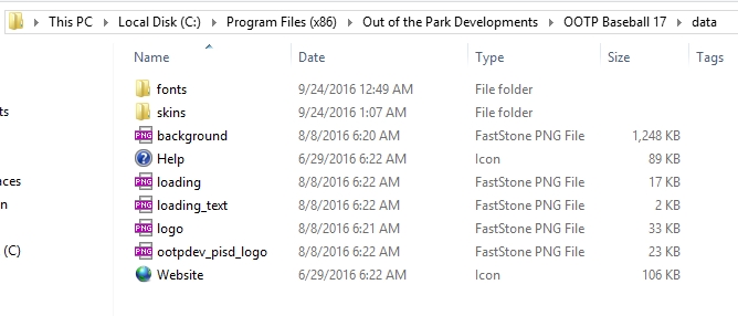 The strange thing about this situation is that the patch installer creates default league folders in C:\Program Files (x86)\Out of the Park Developments\OOTP Baseball 17\data instead of the usual C:\Users\Bruce\Documents\Out of the Park Developments\OOTP Baseball 17. Everything from backgrounds to world_templates. Why that is, I don't know; maybe it's something that I and other users do wrong when running the patch?