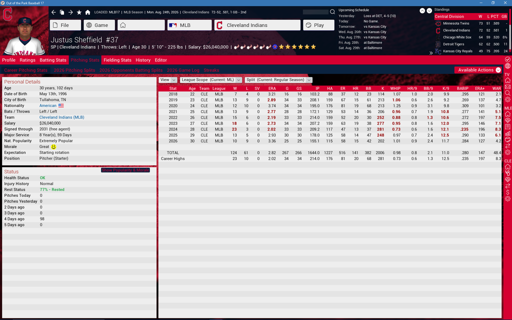 As for Justus Sheffield, he is an absolute monster in my league. It's still early in his career (2023), but he already has two Cy Young Awards. Considering the other poster who said that Sheffield won 6 in his, I would say that you should hang on to him. |