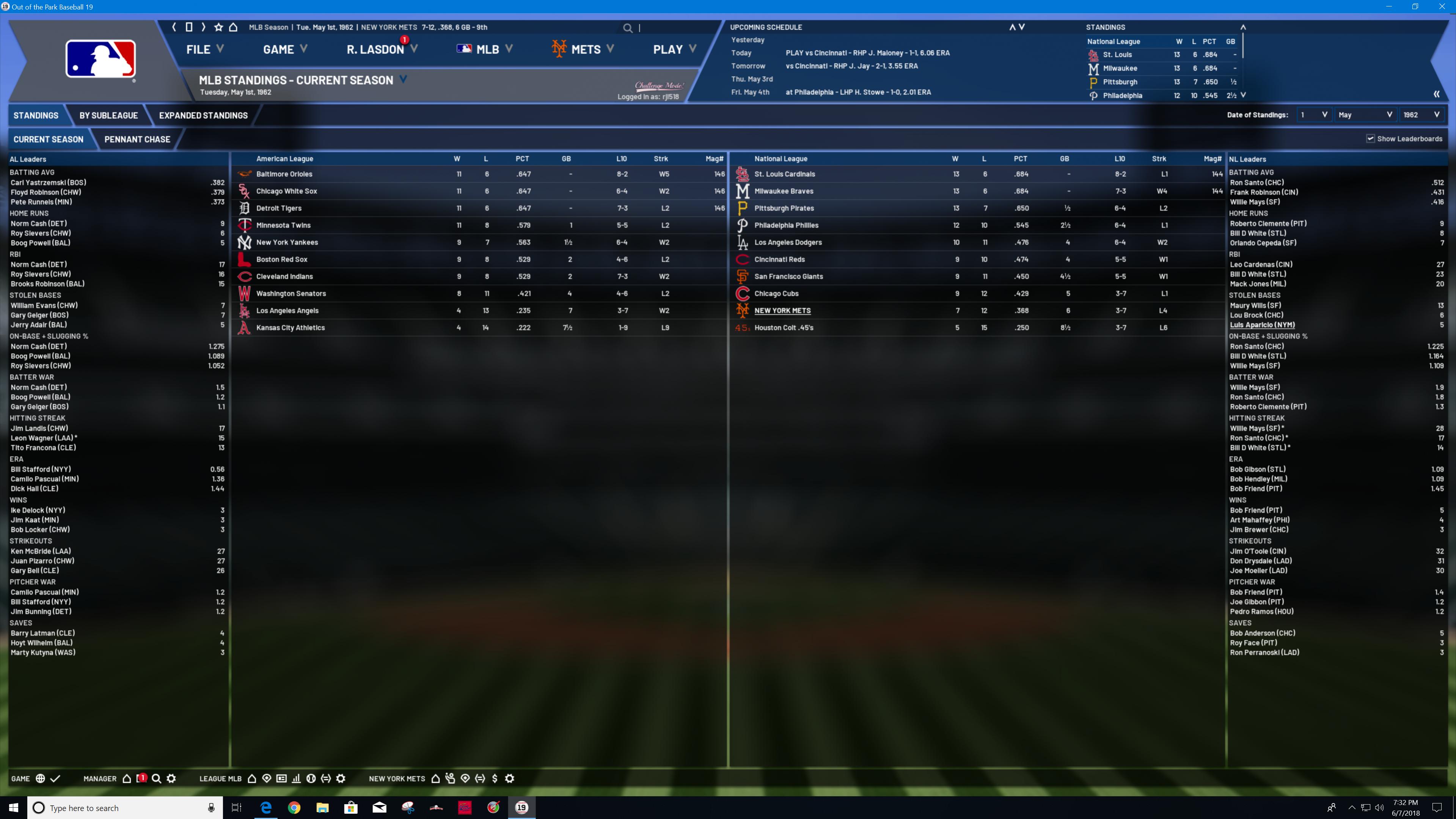 NY METS 0 STL Cardinals 2 Sportsman's Park In this dynasty, im not going to give much commentary for each game like I do in my real-time season. I will let the automatic Game Recaps tell the story. I also will only put up the league standings pics after Sunday games to prevent clutter. However, this was a good one as I decided to play the Opening Day matchup. Johnny Podres vs. Bob Gibson. Not too bad. Elio Chacon got the 1st Mets hit of the franchise and Gus Triandos got the 1st double. Yeah, we got shutout, but its ok. We went up against Gibson, so I would have been shocked if we had won this game. Next Game: 4/11/62 @ STL Cardinals. (Sportsman's Park)