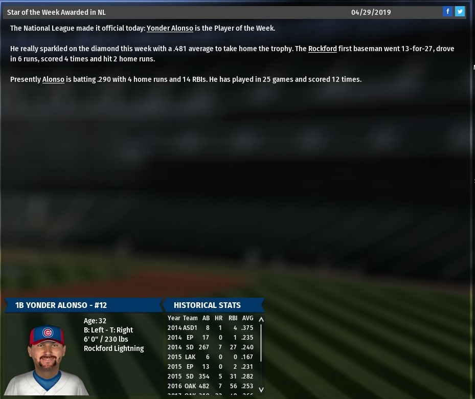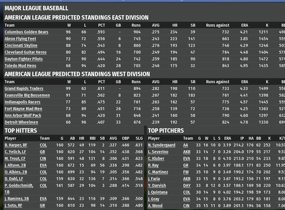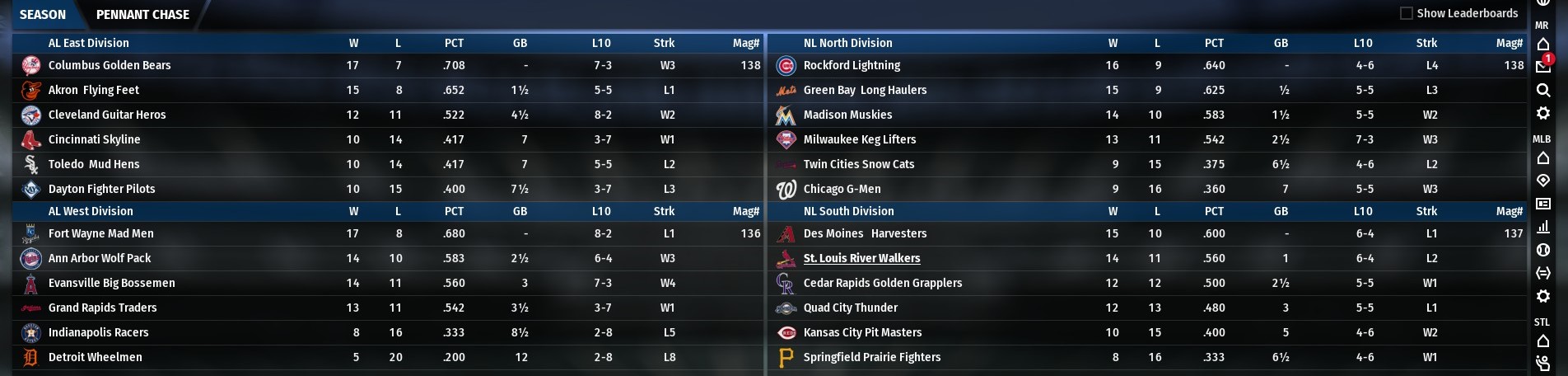 The debut campaign of the Midwest Baseball League has come to a conclusion, as I have gotten through the season and 2019 preseason and all the spring training games. While the St. Louis River Walkers won the title in a walk-away, following a dominating 106-56 performance in the regular season they needed just four games (NLCS) and six games (World Series) to secure the title, the rest of the league seemed effectively balanced. Outside of St. Louis’ division, the NL South which it won by 14 games, and the AL West, which Indianapolis won by seven games, one of the divisions featured a one game divide (Dayton winning the AL East) and another had to be decided by a one game playoff (Chicago defeating Madison to take the NL North). There will be some changes in format for the2019 season, as interleague play will be incorporated. Also, all the teams will have new home stadiums. If the team is located in a city which has an MLB franchise, it will play in an established ballpark in that city from an earlier era. If the city does not have an MLB team, it will be assigned a historic ballpark. The teams and their assignments AL East Stadium Akron Candlestick Park 1993 Cincinnati Riverfront Stadium 1970 Cleveland Cleveland Stadium 1980 Columbus Forbes Field 1959 Dayton Memorial Stadium 1986 Toledo Braves Field 1946 AL West Ann Arbor Crosley Field 1958 Detroit Tiger Stadium 1980 Evansville Yankee Stadium 1952 Indianapolis Astrodome 1995 Fort Wayne Ebbets Field 1948 Grand Rapids Polo Grounds 1923 NL North Chicago Wrigley Field 1979 Green Bay War Memorial Stadium Madison Comiskey Park 1969 Milwaukee County Stadium 1976 Rockford RFK Stadium 1962 Twin Cities Metrodome 1996 NL South Cedar Rapids Shibe Park 1949 Des Moines LaBatt Park (fictional) Kansas City Municipal Stadium 1969 Quad City Fenway Park 1970 St. Louis Busch Stadium 1997 Springfield Olympic Stadium |