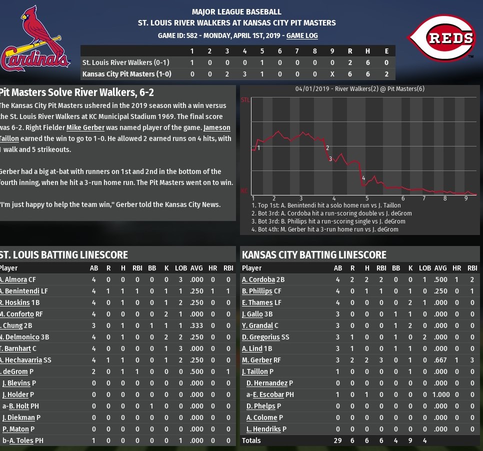 The St. Louis River Walkers' defense of their 2018 Midwest Baseball League championship got off to a rough start, as they dropped their season opener 6-2 to the Kansas City Pit Masters in K.C. Jacob deGrom, the 2018 NL Cy Young winner, was not at his best lasting just four innings during which he allowed all six Masters' runs. K.C. took a 2-1 lead in the bottom of the third inning on an RBI double from Allen Cordoba and a run-scoring single by Brett Phillips. A three-run homer from Mike Gerber in the fourth made it 5-1. A solo shot from Cordoba to lead off the sixth pushed it to 6-2. Jameson Taillon went the first five innings for Kansas City, allowing both St. Louis run, to earn the win. Four relievers combined to hold the Walkers scoreless the rest of the way. |