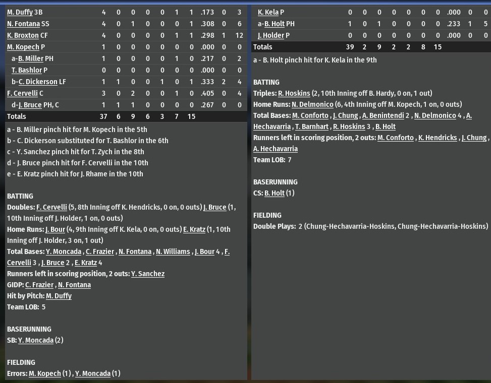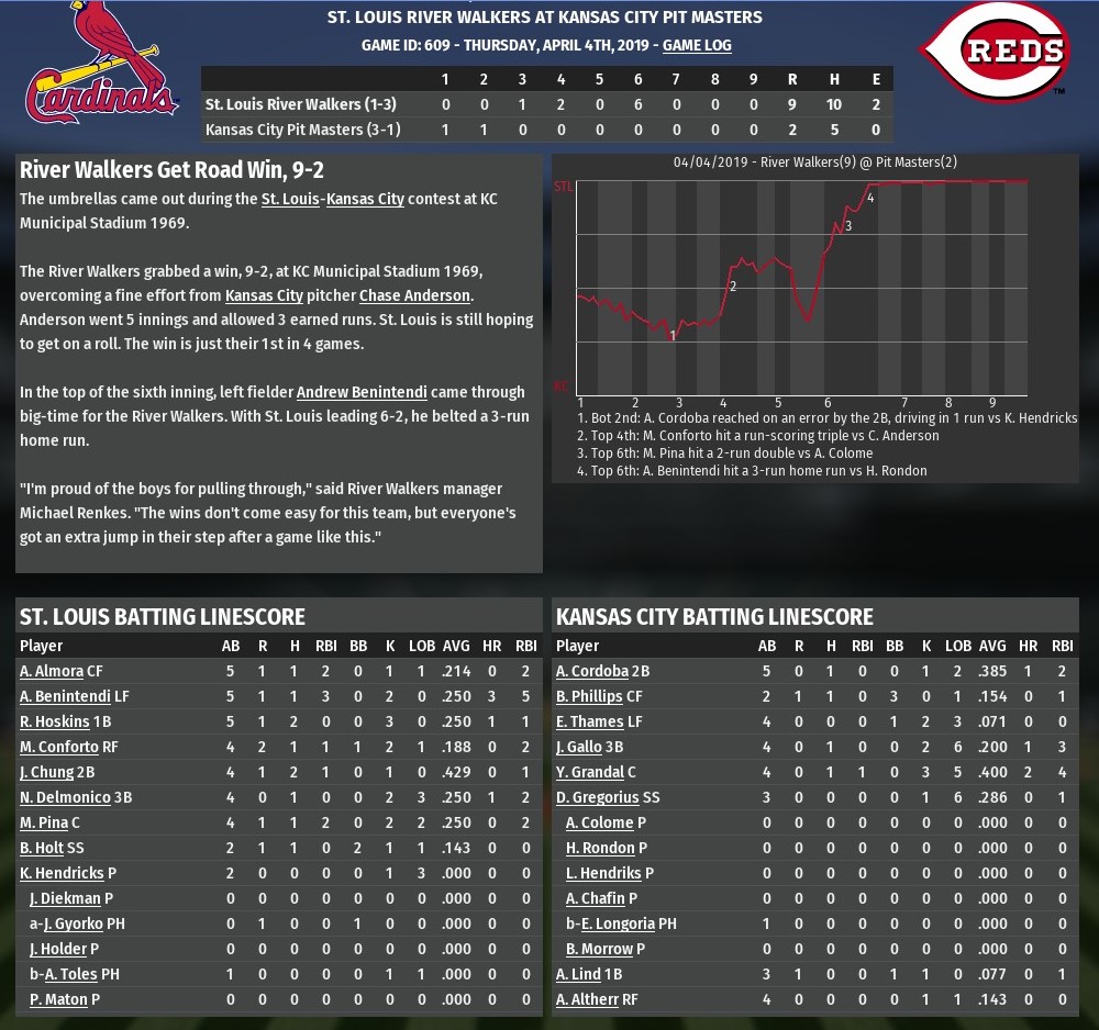 It took four games, but the defending MBL champion St. Louis River Walkers finally earned their first win of the season, downing the Kansas City Pit Masters 9-2 in the finale of their opening series in Kansas City. Down 2-0, the Walkers got on the board in the top of the third on an Albert Almora ground out which scored Brock Holt, who had opened the inning with a double off K.C. starter Chase Anderson. St. Louis took the lead an inning later, when Rhys Hoskins and Michael Conforto opened the inning with back-to-back triples. A Jin Hwan-Chang ground out later scored Conforto. The Walkers later made it a blow out with six runs in the sixth. Manny Pina plated two of the runs with a double. Albert Almora had a run-scoring single. Andrew Benintendi did the rest with a three-run homer. Kyle Hendricks pitched into the fifth, but had to come out when the Masters loaded the bases with one out. Four relievers handled the rest of the load, not allowing a run. |