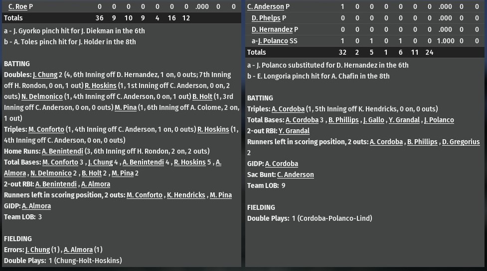 St. Louis and Chicago battled through 8.5 scoreless innings until the River Walkers' Michael Conforto hit a two-run home run off the G-Men's Michael Feliz in the bottom of the ninth to give his team a 2-0 win at Busch Stadium. River Walkers starting pitcher Zach Godley tossed 6.1 scoreless innings, before being replaced by three relievers (Jerry Blevins, Jake Diekman and Brad Boxberger) who completed the nine innings of shutout baseball G-Men starting pitcher Bryan Mitchell went six scoreless innings and was followed by two relievers (Jeurys Familia and Sean Doolittle) who both tossed a scoreless innings. Feliz took the mound in the bottom of the ninth, allowing a lead-off double to Jin-hwan Chung. Conforto followed with his seventh homer of the season. |