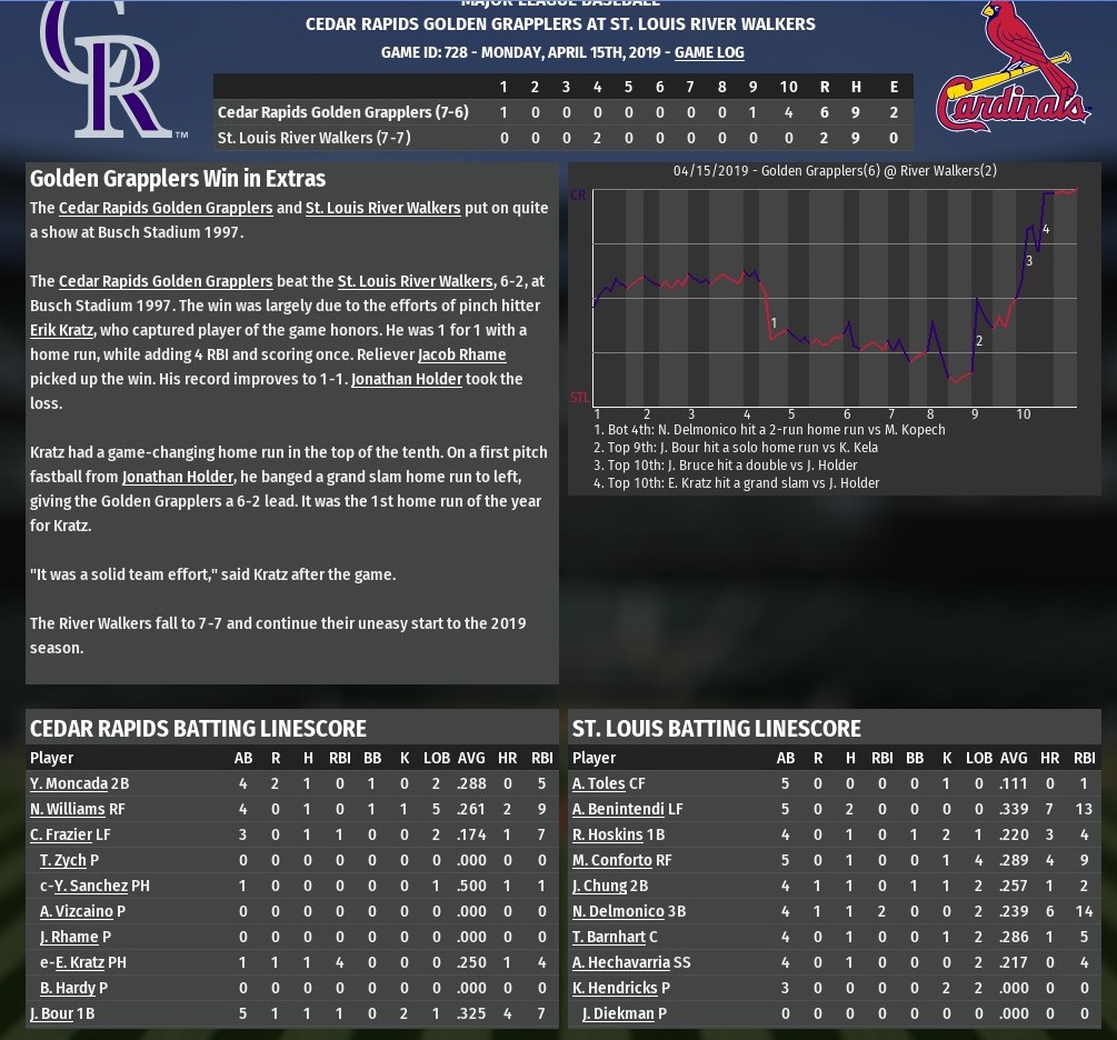 The St. Louis River Walkers scored five times in the bottom of the fifth inning to take control en route to a 9-5 win over the Springfield Prairie Fighters in their home opener at Busch Stadium. Down 3-1, the Walkers broke loose against Springfield starting pitcher Gerrit Cole. Tucker Barnhart and pitcher Jacob deGrom both had RBI singles before Albert Almora added a two-run double. Rhys Hoskins drove in the final run of the outburst with a single. The Fighters scored twice in the top of the sixth, pulling to within 6-5. But St. Louis put it away with three homers in the eighth. Hoskins hit the first off Carl Edwards Jr. Chung also took Edwards deep. Nicky Delmonico made it a back-to-back with Chung, hitting his off Carter Capps. Andrew Benintendi also homered for the Walkers, with a solo shot in the bottom of the first to make it 1-0. After two rough outings to start the season, deGrom wasn't dominating but was better lasting into the sixth inning and allowing five runs (four earned). Four relievers combined to shutout Springfield the rest of the way. The game was the opener of a doubleheader, as the scheduled home opener on the previous day had been rained out. |
