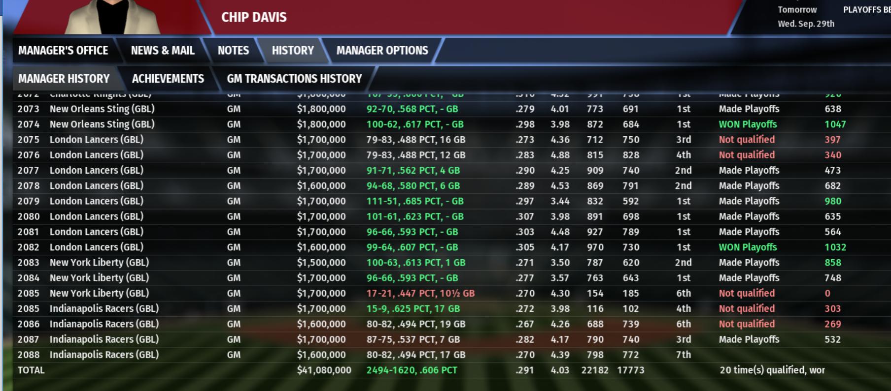 I always found it hilarious that in my previous long-running save, I made the playoffs every team, won numerous championships, and all of it. Then I joined OOTP Developments and the next year was the first one I missed the playoffs
