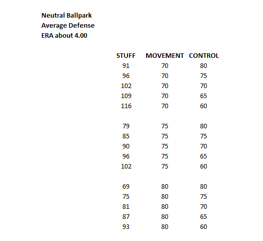 Oh yeah, here's a chart I did awhile back comparing the ratings to some stats for starters in a Perfect League I was in. You can see they are fairly well correlated, although there's definitely not clear cutoff points. The 70 is more from experience and knowing the available pool of players.