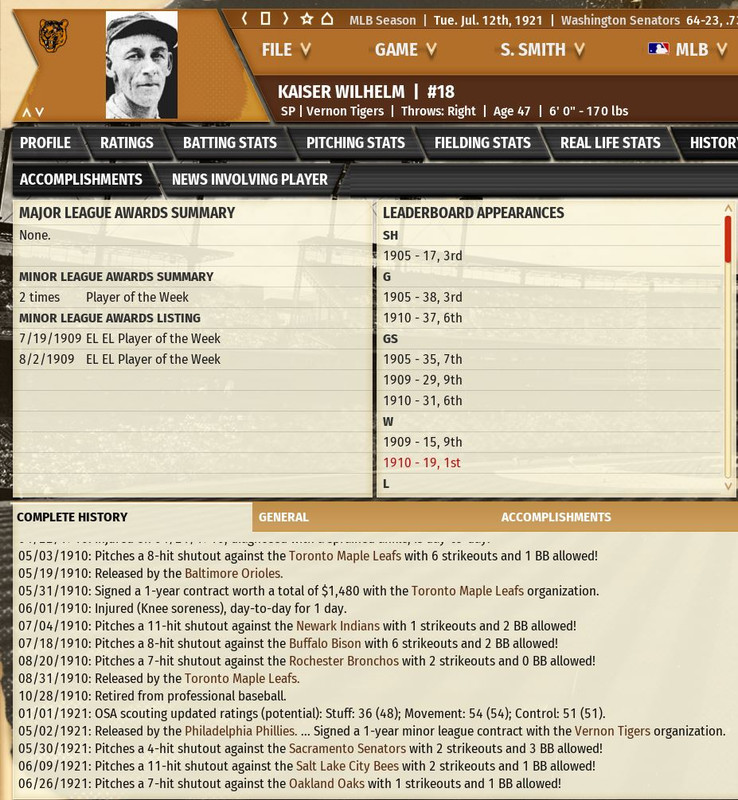 to pitch again. This time Fred Toney went down with a CEI in 1916. Fast forward to 1921 and he is part of a trade between NY and Boston. So how can he retire with a CEI and come back to pitch again? Also again his age is off by a few years. ![]() Another is Kaiser Wilhelm, he retired in 1910 and in 1921 he is back and released by the Phillies, I have no clue how he got on their roster. Plus his age is off by 10 years.