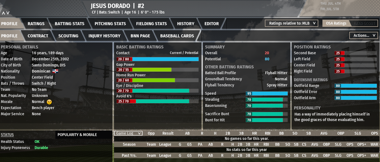 Well, we're gonna find out. In an amazing twist of fate, two transcendent once-in-a-generation prospects were discovered in 2019. First, there was Bobby J. Smith. Discovered out of high school, scouts were awed by his sweeping movement, stellar command, and insane velocity. Runners are scared to death of him, and he could be a top-of-the-line fielder. Then, scouts learned of Jesus Dorado. Found playing in the streets of the Dominican Republic when he was just 16, his speed and arm were tremendous, his contact was outstanding, and he had MASSIVE power. And to top it off, they're both great teammates, true leaders, and don't give off any sign of greed. They also never seem to get tired or injured. They're pretty raw now, but there's just SO MUCH potential in both of them. The sky is the limit. Let's see what they do. Last edited by Brennan; 04-20-2019 at 09:59 PM. |